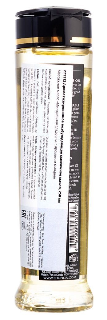 Массажное масло Almond Sweetness с ароматом миндаля. Чувственное удовольствие прикосновения и невероятно волнующий аромат накаляют вашу близость с этим сочным маслом Shunga Kissable Massage Oil, которое скользит по коже, как шелк. Смесь сертифицированных органических растительных масел. Натуральная добавка - миндаль. Натуральное и съедобное. Усильте удовольствие и ощущения эрогенных зон вашего партнера… Кроме того, оно абсолютно безопасно, благодаря натуральным компонентам, входящим в его состав!
