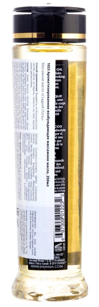 Массажное масло с ароматом цветков лотоса Amour Sweet Lotus. 100% натуральные масла холодного отжима, с витамином Е (антиоксидант), без жирных остатков, не забивает поры, нет минерального или животного масла. Мягкость и шелковистость этого масла с приятным скользящим эффектом на коже вызывает ощущение полного восторга. Сексуальное желание нарастает и вы готовы к любви. Получите взаимное удовольствие от чувственного эротического массажа с использованием нашей эксклюзивной смеси масел холодного отжима, тщательно отобранных за свои стимулирующие и придающие энергию свойства. Масло легко скользит по коже, не оставляя жирных ощущений, в то время как различные экзотические ароматы поднимут ваши чувства до вершин возбуждения. Идеально подходит для того, чтобы насладиться расслабляющим массажем или сделать его, совместив с обволакивающими обольстительными ласками. Это на 100 % натуральное масло с упоительным ароматом, легко скользит по коже, не оставляя жирной пленки. Запах массажному маслу придают эфирные масла и отдушки, что в отличие от большей части другой продукции SHUNGA, ароматизированной вкусовыми добавками, делает его несъедобным.