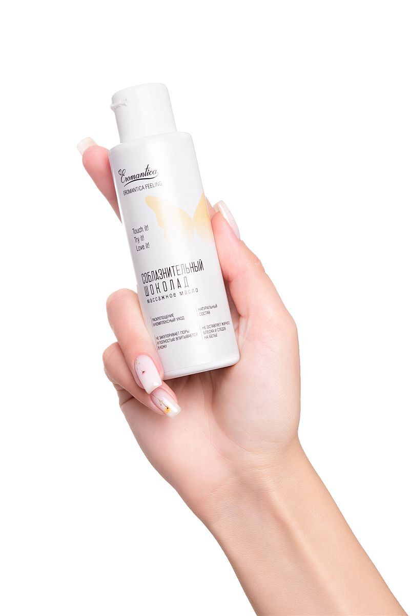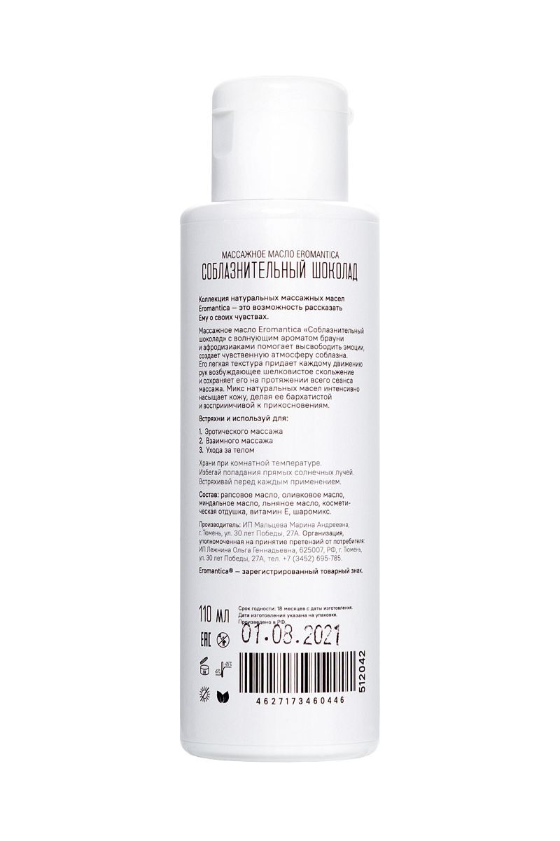 Коллекция натуральных массажных масел Eromantica — это возможность рассказать Ему о своих чувствах. Массажное масло Eromantica «Соблазнительный шоколад» с волнующим ароматом брауни и афродизиаками помогает высвободить эмоции и создает чувственную атмосферу соблазна. Его легкая текстура придает каждому движению рук возбуждающее шелковистое скольжение и сохраняет его на протяжении всего сеанса массажа. Микс натуральных масел оливы, миндаля и семян льна интенсивно насыщает кожу жирными кислотами, витаминами и микроэлементами, делая ее бархатистой и восприимчивой к прикосновениям. Встряхни и используй для: Эротического массажа: согрей масло в ладонях и распредели его по телу партнера плавными массажными движениями. Особое внимание уделяй эрогенным зонам. Взаимного массажа: нанесите масло на тела друг друга и одновременно совершайте медленные массажные движения. Вы можете массировать грудь, бедра или руки друг друга. Ухода за телом: нанеси сразу после душа на влажную кожу и равномерно распредели по телу.