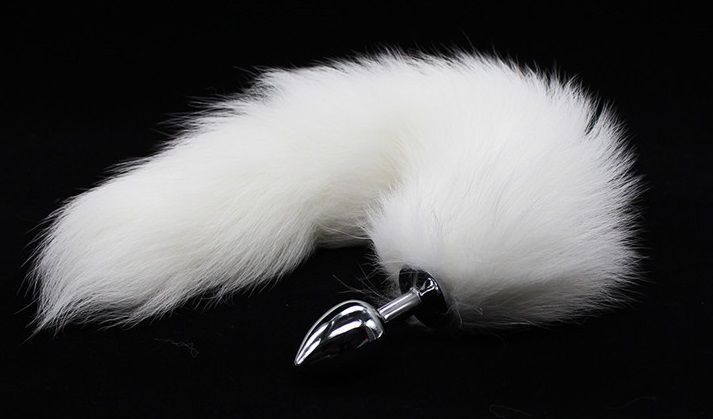 Металлическая анальная пробка с длинным белым хвостиком