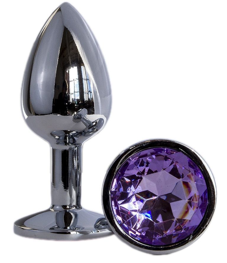 Металлическая анальная втулка с сиреневым кристаллом - 7,2 см.