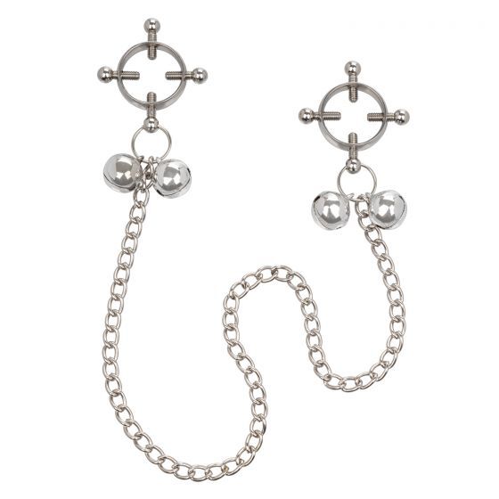 Nipple Grips 4-Point Nipple Press with Bells - зажимы на соски с закручивающимися винтами и украшением в виде бубенчиков и цепочки,/ которая связывает зажимы. Эти тиски для сосков предлагают полностью настраиваемое удовольствие, а полностью регулируемая конструкция позволяет использовать их на всех типах телосложения. Зажимы предназначены не только для украшения, но и стимуляции одной из самых эрогенных зон на теле человека. Под воздействием давления соски становятся более чувствительными и восприимчивыми к ласкам. Зажимы декорированы кристаллами, которые выступают в роли возбуждающего интимного украшения. Закрутите винты, чтобы они сжимали соски. Полностью регулируемая конструкция позволяет контролировать давление. Прикрутите винты ближе друг к другу для плотной посадки или раздвиньте их еще больше, чтобы посадка была более свободной. Внутренний диаметр - 2 см.