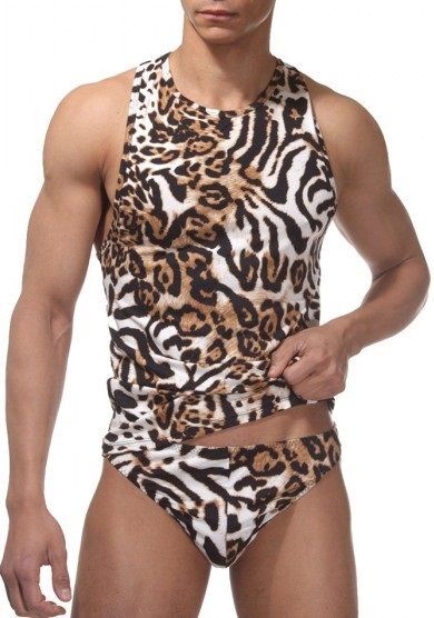 Стильный мужской комплект из майки и трусов-тонг тигровой расцветки. Майка-борцовка, с открытыми плечами. В комплекте: майка, трусы.