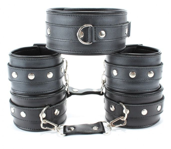 Набор из ошейника, наручников, оков, выполненных из натуральной гладкой кожи черного цвета, декорирован заклепками. У каждого аксессуара есть одно сварное полукольцо. Пряжка сзади позволяет выбирать плотность прилегания атрибутов. Ошейник подойдет на обхват от 26 до 40 см, наручники на обхват руки от 15 до 25 см, оковы подойдут на обхват от 15 до 27 см. Все составляющие можно скреплять по вашему желанию кожаными соединениями на карабинах. Мягкая кожа и практичные соединения обеспечат максимальный комфорт в использовании. Ширина манжет - 6 см. Ширина ошейника - 6 см. Длина соединений - 14 см.