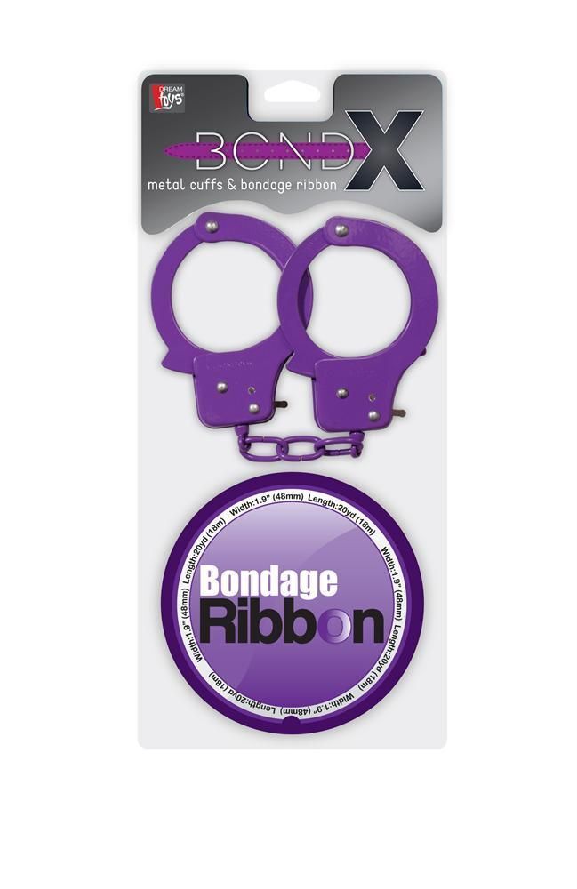 Набор для фиксации BONDX METAL CUFFS AND RIBBON: фиолетовые наручники из листового материала и липкая лента из ПВХ. Ключики в комплекте. Длина ленты - 18 м., ширина - 4,8 см.