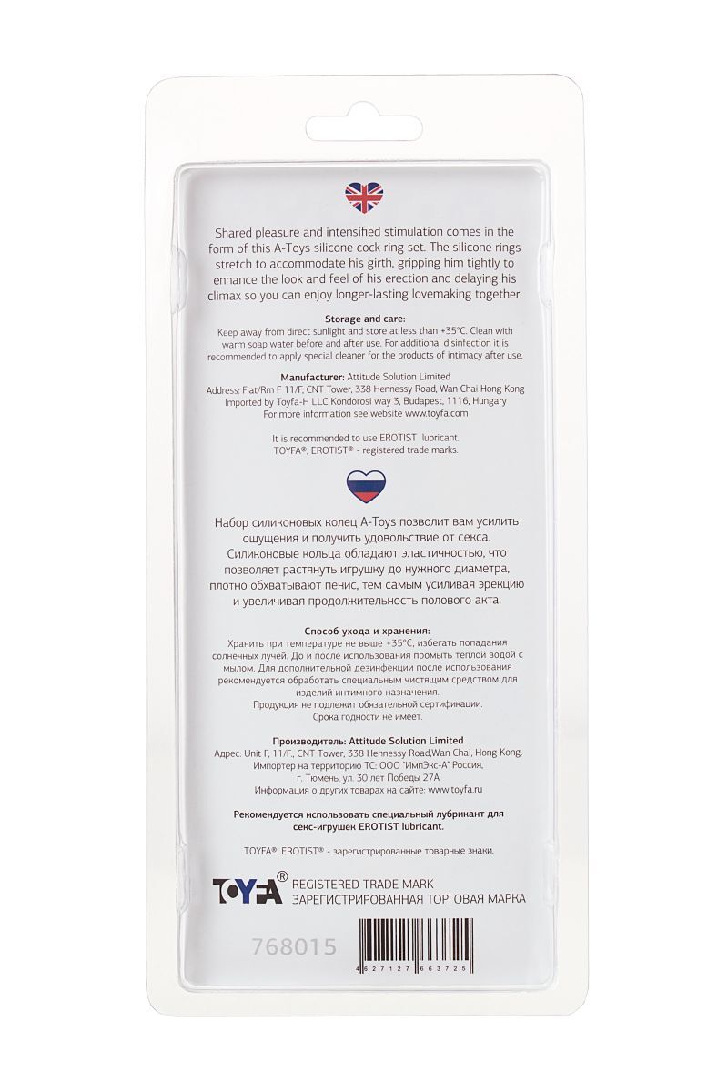 Набор силиконовых колец А-toys позволит вам усилить ощущения и получить удовольствие от секса. Силиконовые кольца обладают эластичностью, что позволяет растянуть игрушку до нужного диаметра, плотно обхватывают пенис, тем самым усиливая эрекцию и увеличивая продолжительность полового акта. Диаметр колец - 3,2, 3,8 и 4,5 см.