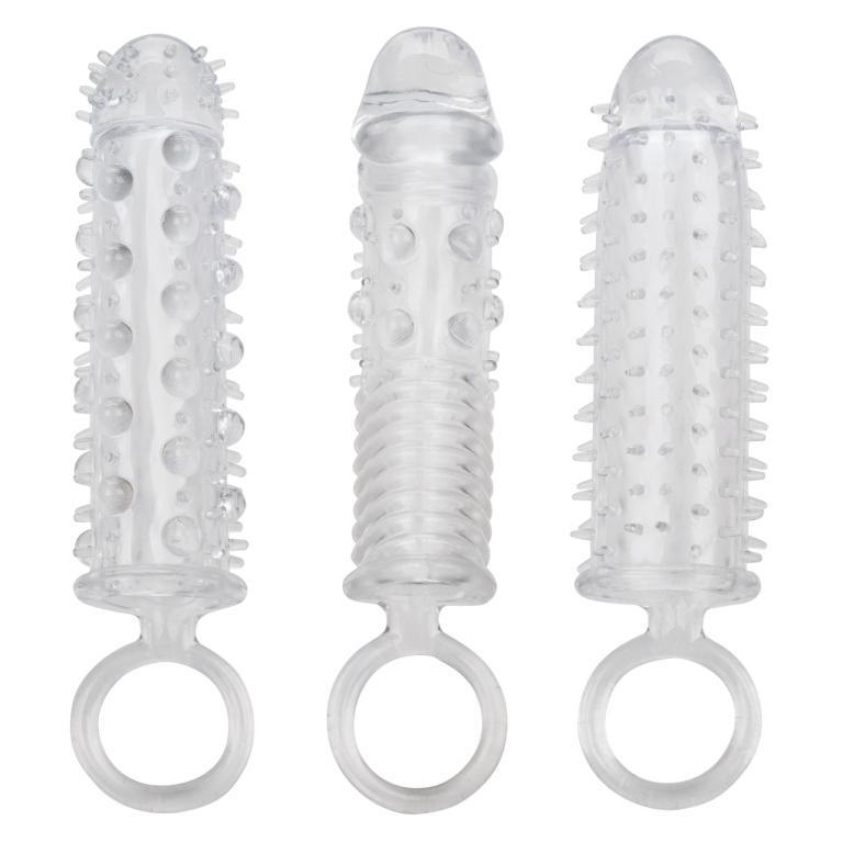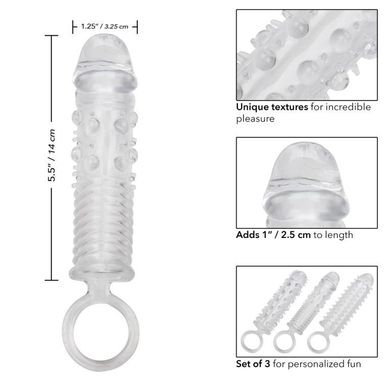 3 Piece Textured Extension Set - это набор насадок закрытого типа с эрекционным кольцом для увеличения длины и обхвата полового члена и дополнительной стимуляции во время полового акта. Насадки выполнены из сверхмягкого и безопасного эластомера. 3 Piece Textured Extension Set предназначен для увеличения длины, а благодаря специальным шипам насадки осуществляют дополнительную стимуляцию, эрекционное кольцо на конце насадки улучшит качество и увеличит продолжительность полового акта. Просто введите пенис внутрь насадки. Диаметр подхватов мошонки - 3,25 см.