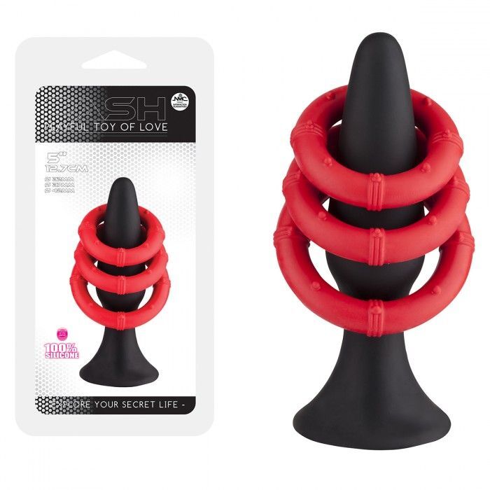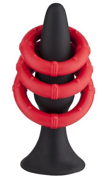 Черный плаг для анальной стимуляции из силикона. В наборе 3 красных силиконовых кольца, которые можно использовать на пенисе и мошонке. Диаметр колец - 3, 3,5 и 4 см. Рабочая длина пробки - 10 см., диаметр - 3 см.