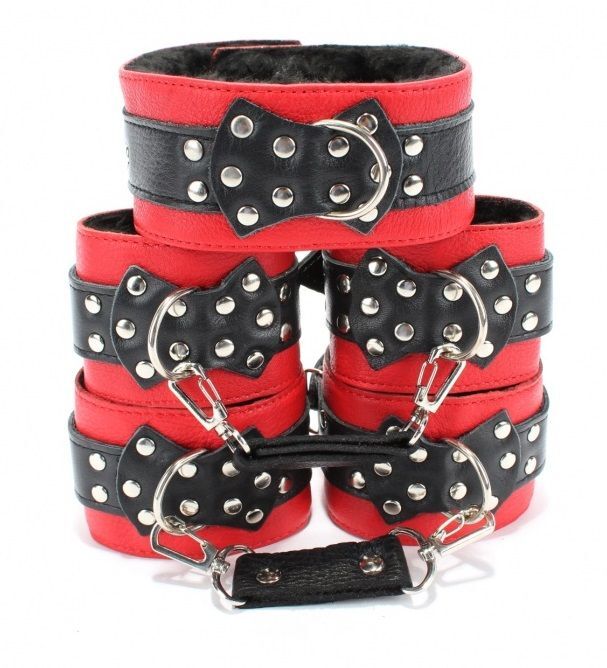 Набор состоит из наручников, оков и ошейника, выполненных из натуральной кожи красного цвета со вставками из черной кожи. Подклад из черного эко-меха нежно прилегает к телу. Декор в виде банта с металлическим кольцом посередине на каждом изделии придает пикантности для самых смелых фантазий. Все составляющие надежно фиксируются ремнями и металлическими пряжками, позволяющими выбрать нужный размер, наручники подойдут на обхват руки от 14 до 25 см. Ошейник подойдет на обхват от 28 до 37 см. Оковы подойдут на обхват от 16 до 26 см. Атрибуты можно скреплять по вашему желанию кожаными соединениями на карабинах. Ширина манжет - 6 см. Длина соединений - 15 см.