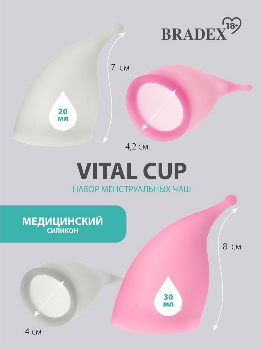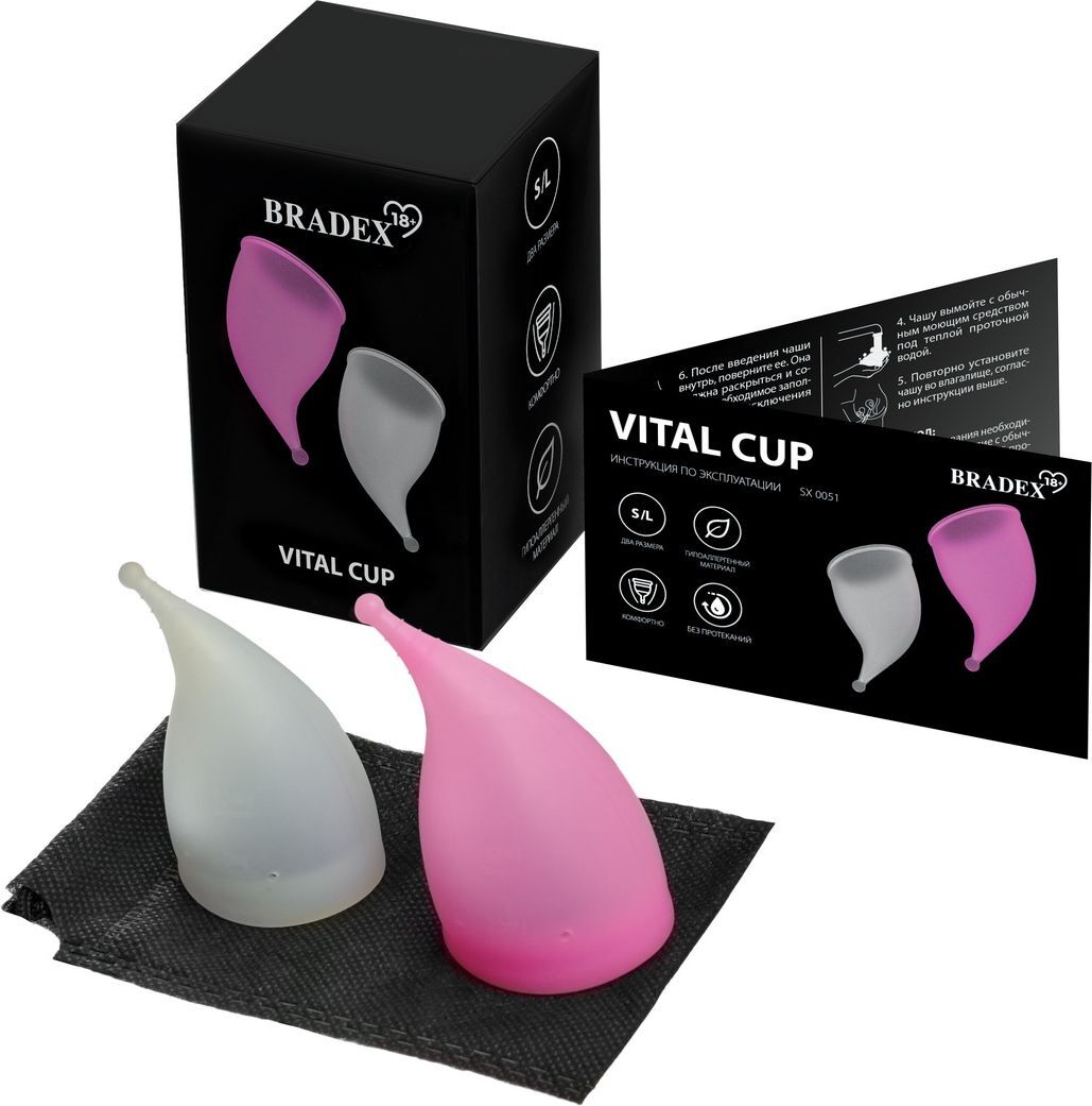 Набор менструальных чаш Vital Cup (размеры S и L) – безопасная, экологичная и экономичная альтернатива одноразовым гигиеническим прокладкам, тампонам во время менструации. В комплект входят чаши двух размеров для комфортного использования в разное время менструального цикла: размер S - для небольших и средних выделений, размер L - для обильных выделений. Многоразовые менструальные чаши выполнены из высококачественного гипоаллергенного медицинского силикона, мягкого и нежного на ощупь. Изделие имеет анатомическую форму и защиту от протекания до 8 часов, в том числе во время ночного сна. Использование менструальных чаш в критические дни позволяет женщине комфортно себя чувствовать и вести активный образ жизни: выполнять повседневные дела, плавать и заниматься спортом. Применение чаши способствует профилактике появления сухости, раздражения в интимной зоне. Силиконовый аксессуар для женской гигиены прост в обращении, его достаточно промыть в прохладной проточной воде. После использования хранить в специальном мешочке, который входит в комплект. Экологичная альтернатива одноразовым прокладкам, тампонам Гипоаллергенный мягкий медицинский силикон Анатомическая форма Без запаха Защита от протекания до 8 часов Два размера чаш S и L для использования в разное время менструального цикла Позволяет вести активный образ жизни Не стесняет движений Легко принимает форму тела и не ощущается внутри Экономичный аксессуар: одной чаши хватает до 2 лет постоянного использования Простой уход Мешочек для хранения в комплекте Длина большой чаши - 8 см., диаметр - 4,2 см. Длина малой чаши - 7 см., диаметр - 4 см.