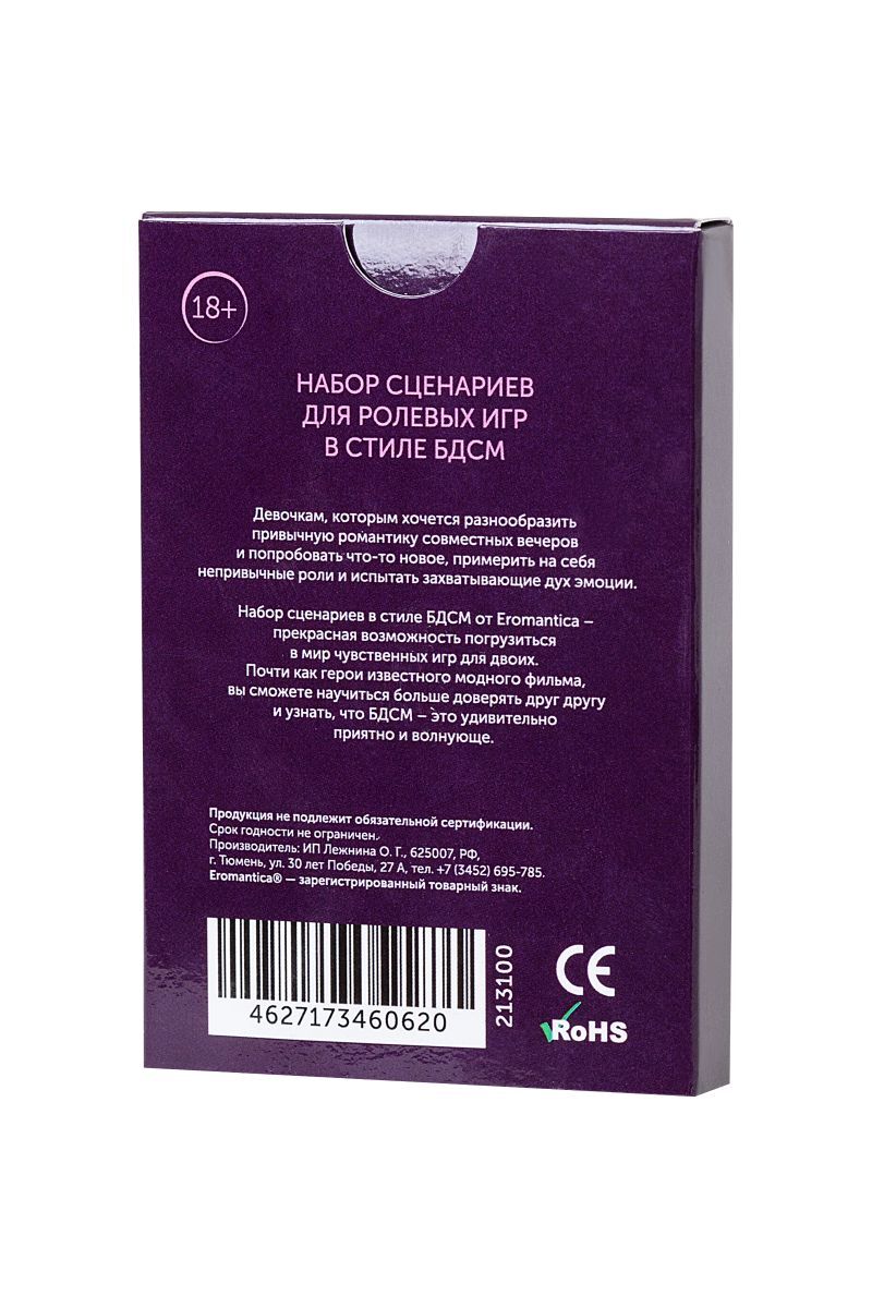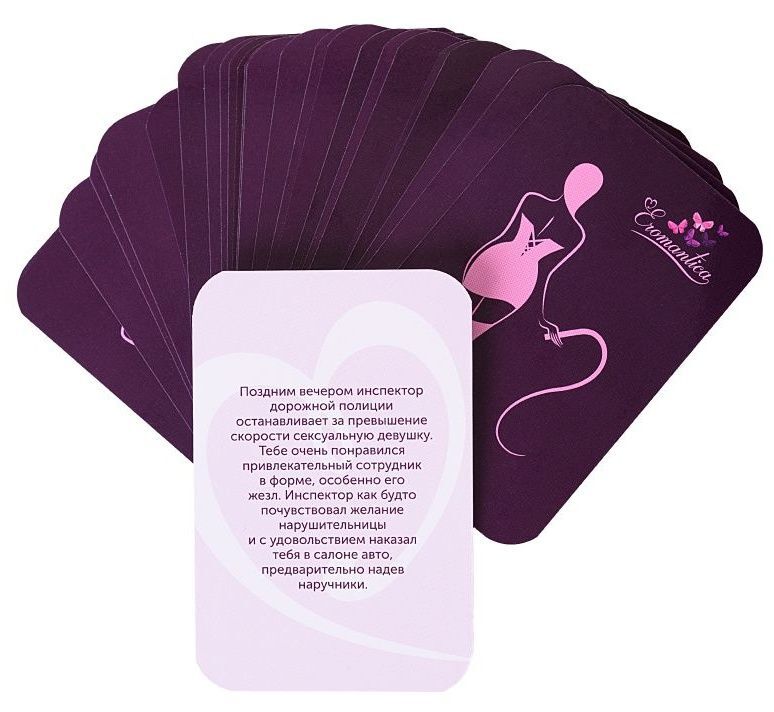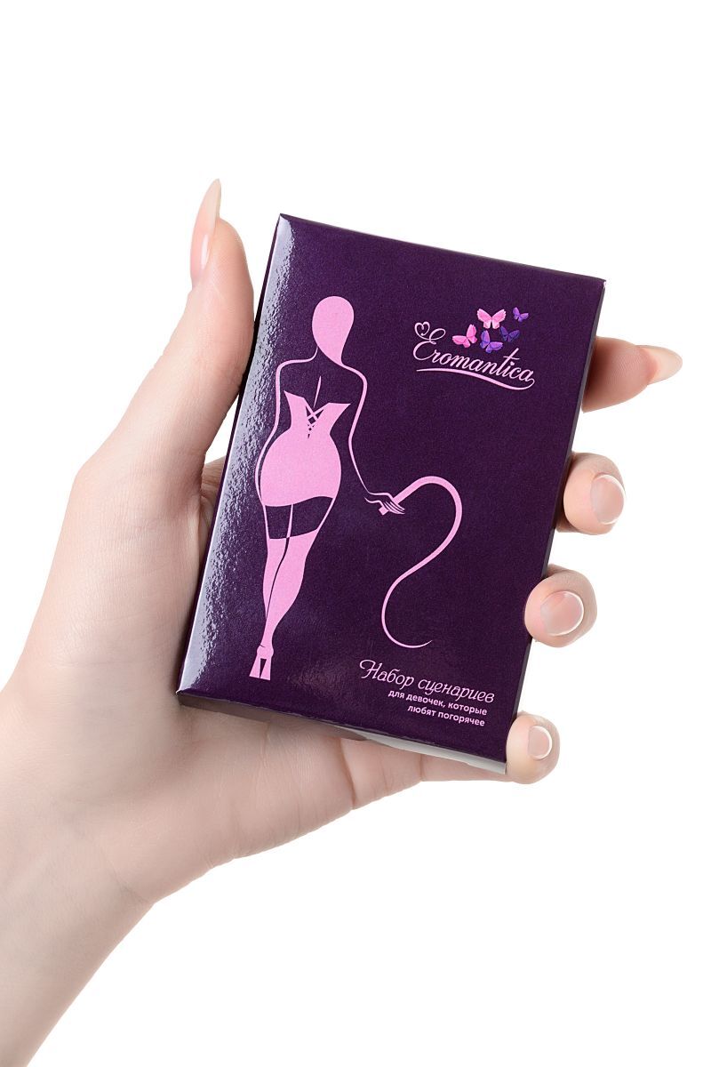 Всем девочкам иногда хочется разнообразить привычную романтику совместных вечеров и попробовать что-то новое… Примерь на себя непривычные роли, проигрывая с партнером сценарии от Eromantica. Если ты из тех, кто любит погорячее, - испытай захватывающие дух эмоции от чувственных игр. Пробуди в партнере интерес к смелым экспериментам. Осталось только определиться со сценарием… 25 карточек со сценариями