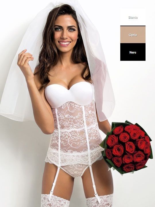 Нежный кружевной корсет, чашки градуированные из микрофибры, по бокам два жестких ребра, крючки на спине. Съемные бретели. Пажи для чулок. Модель дополнена силиконовыми лентами по стану для лучшей поддержки.