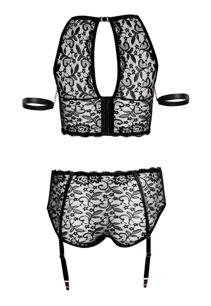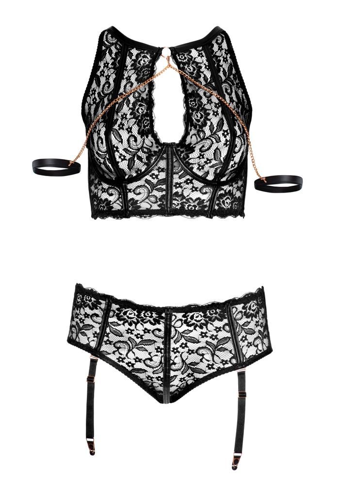 Нежное кружево для пленительных мгновений наслаждения! Комплект из мягкого эластичного кружева в сочетании с матовым эффектом и деталями цвета розового золота. Съемные наручники, которые крепятся к вырезу бюстгальтера с помощью цепочек-карабинов, обеспечат увлекательные моменты удовольствия. Манжеты оснащены практичной застежкой-липучкой. Бюстгальтер на косточках имеет застежку на крючок сзади и небольшую застежку-клипсу в верхней части шеи. Регулируемые подтяжки отстегиваются от трусов. В комплекте: бюстгальтер, трусики-шорты с пажами, наручники. Размеру 85D соответствуют трусики размера L, размерам 90D и 90E - трусики размера XL, размерам 95D, 95E и 95F - трусики размера XXL.
