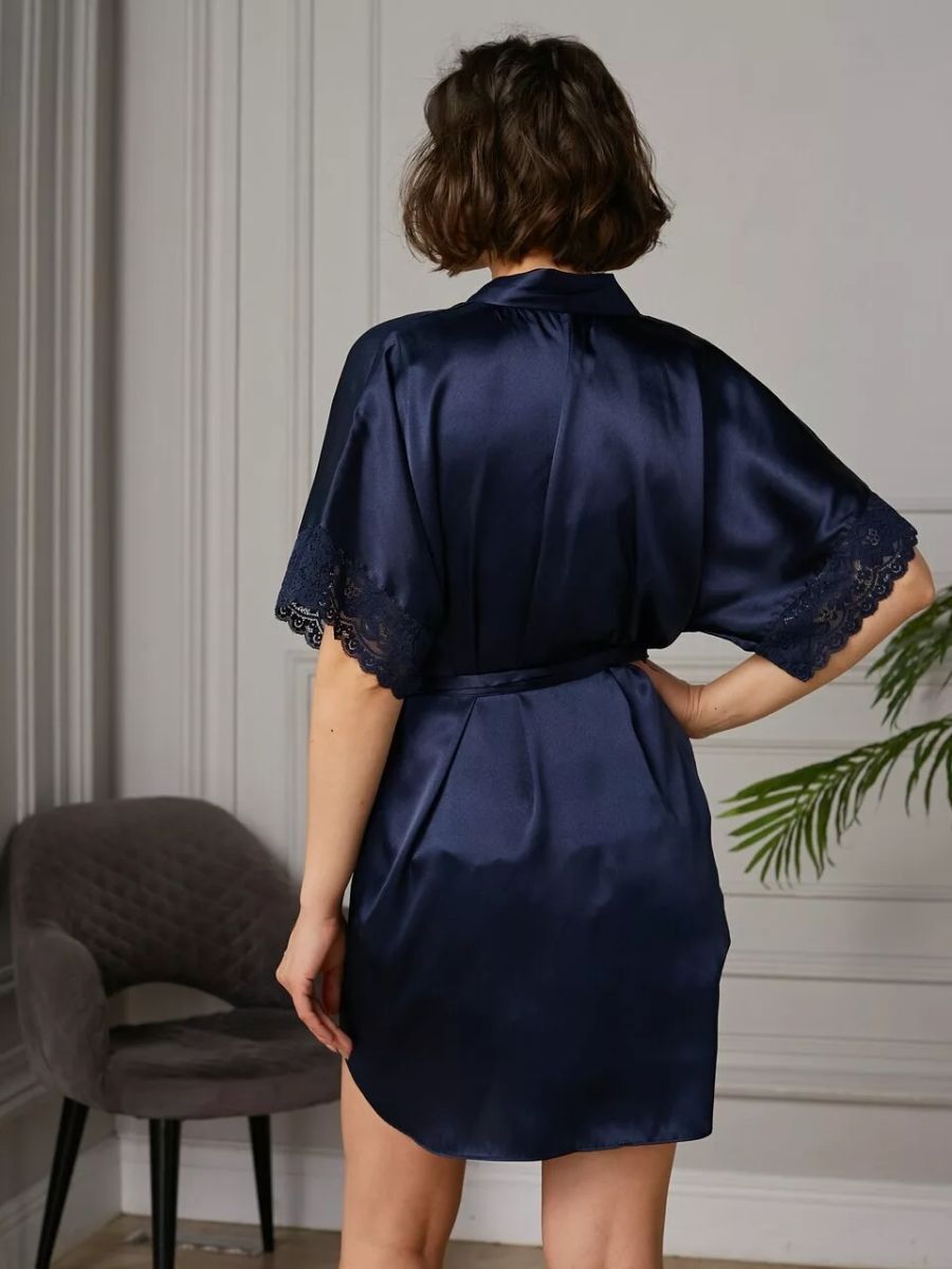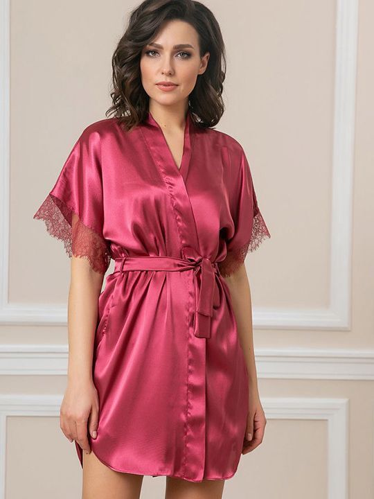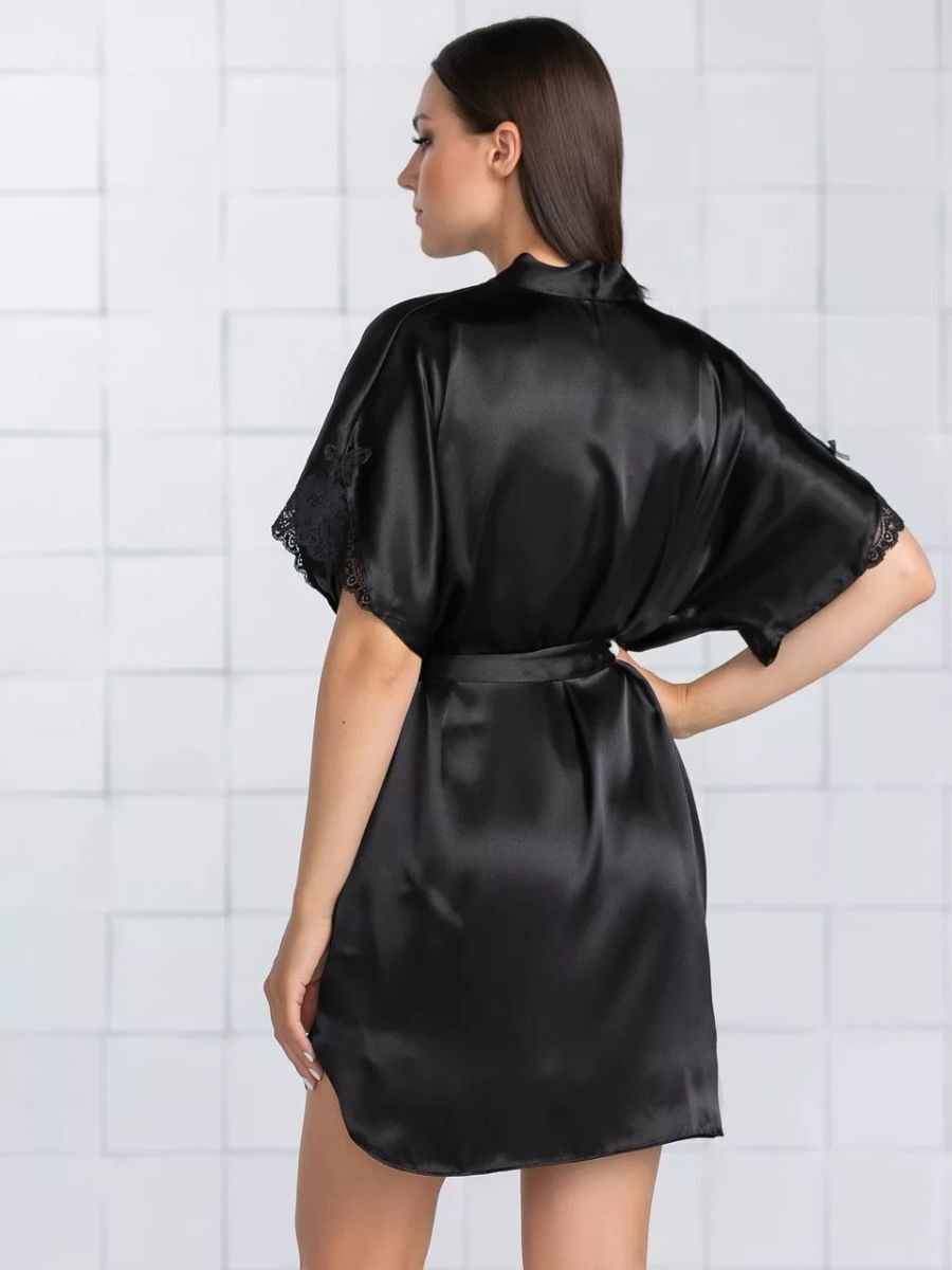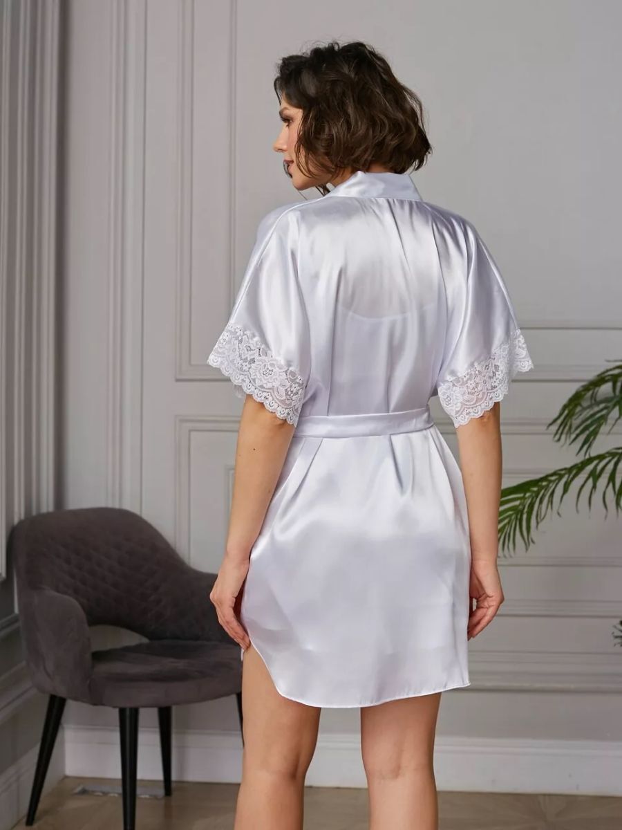 Короткий халат на запах из искусственного шелка с поясом, декорированный кружевом по рукаву.