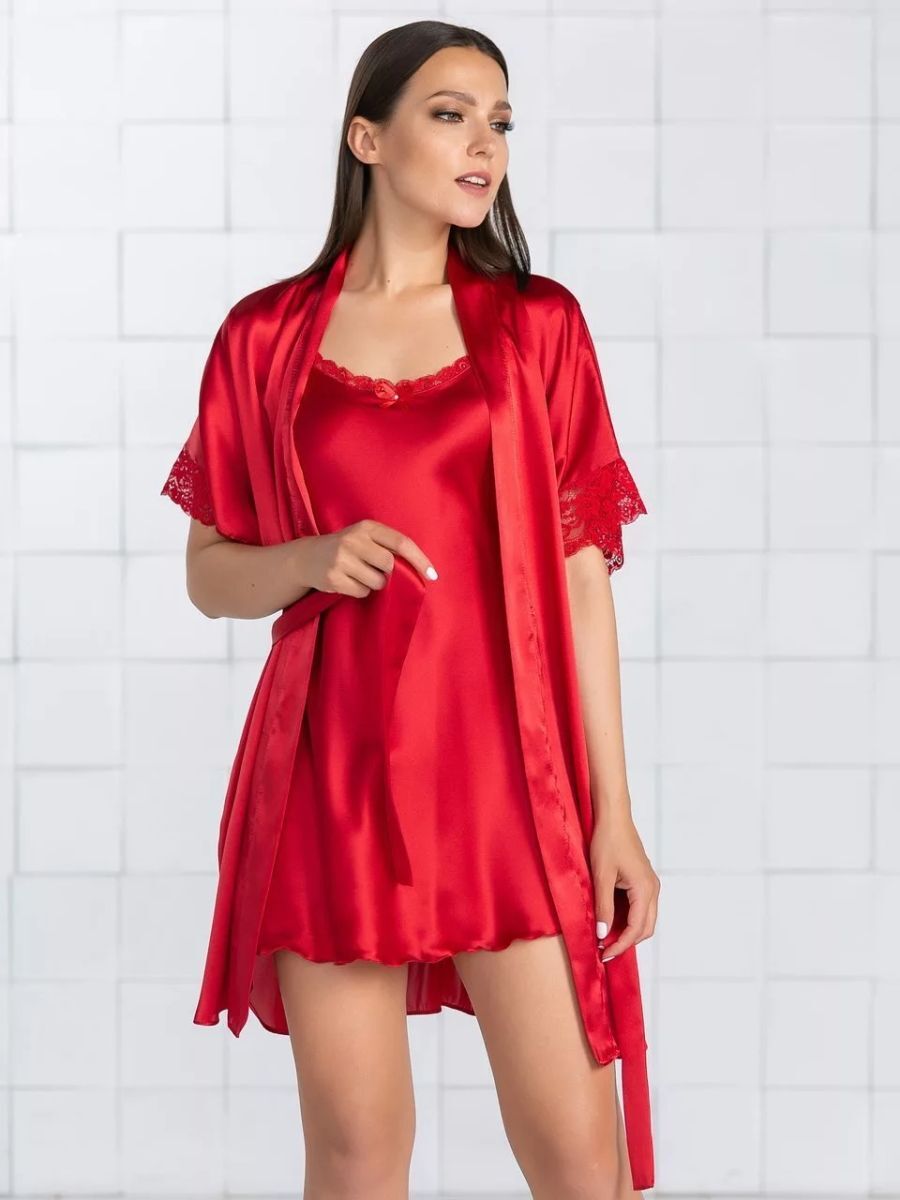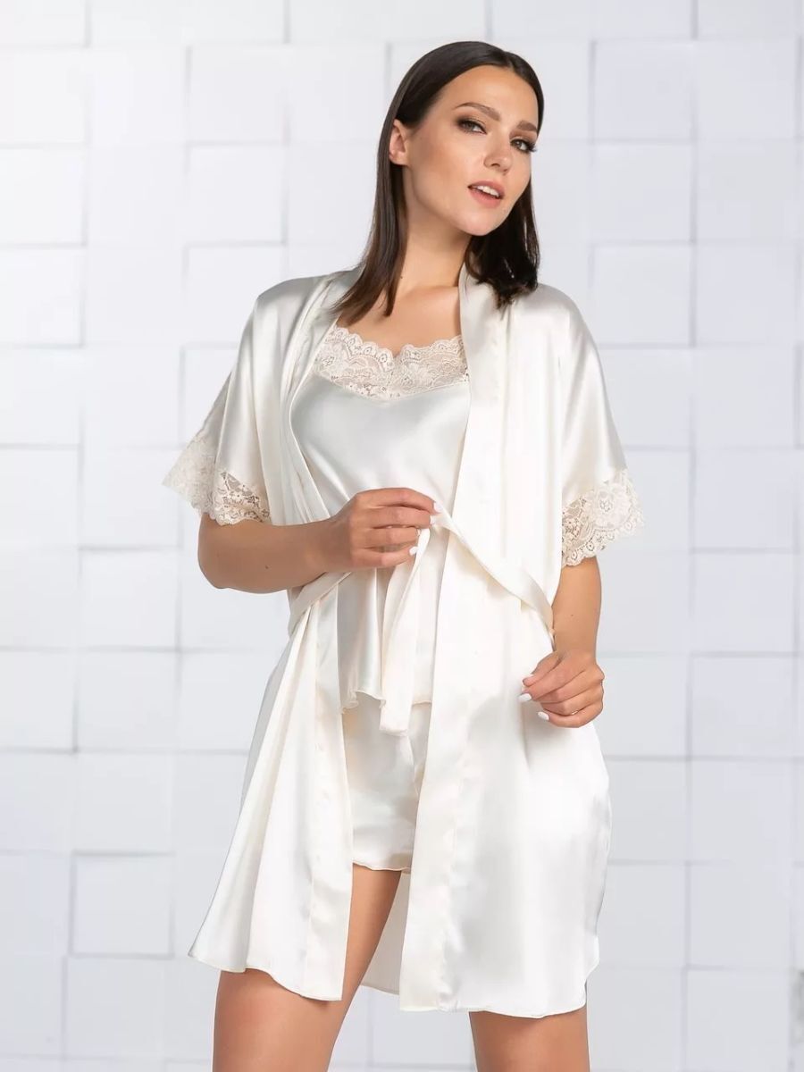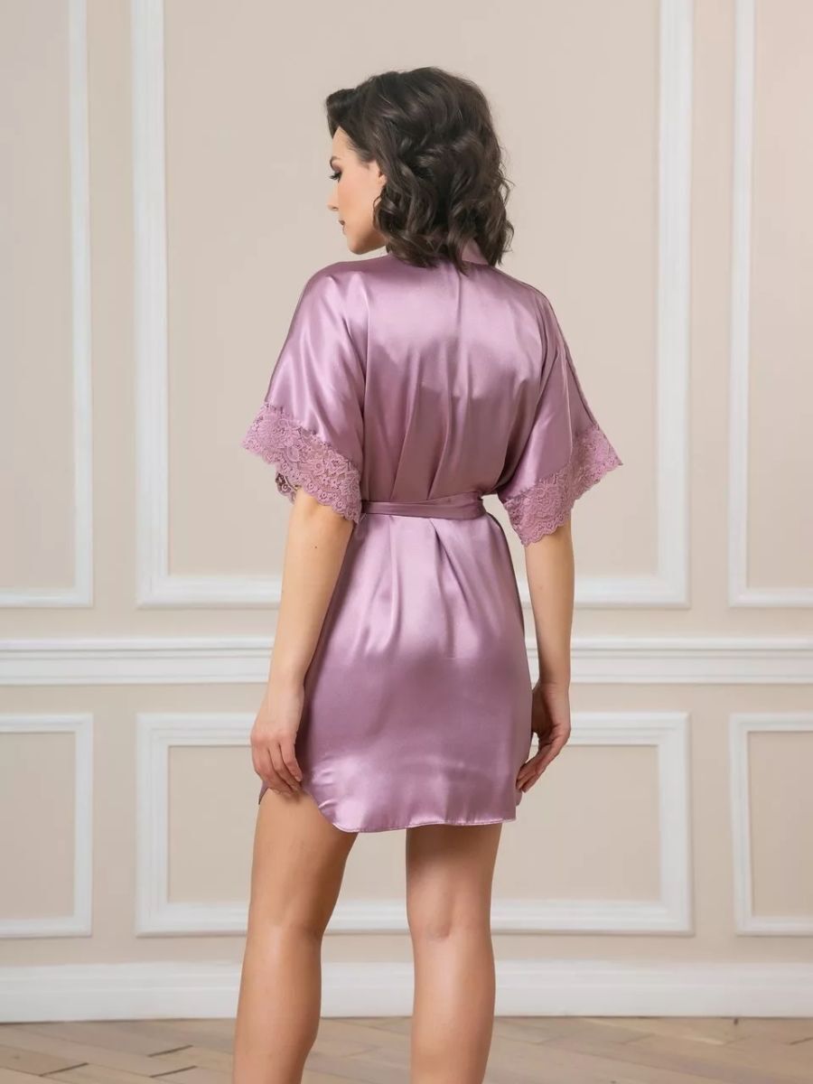 Короткий халат на запах из искусственного шелка с поясом, декорированный кружевом по рукаву.
