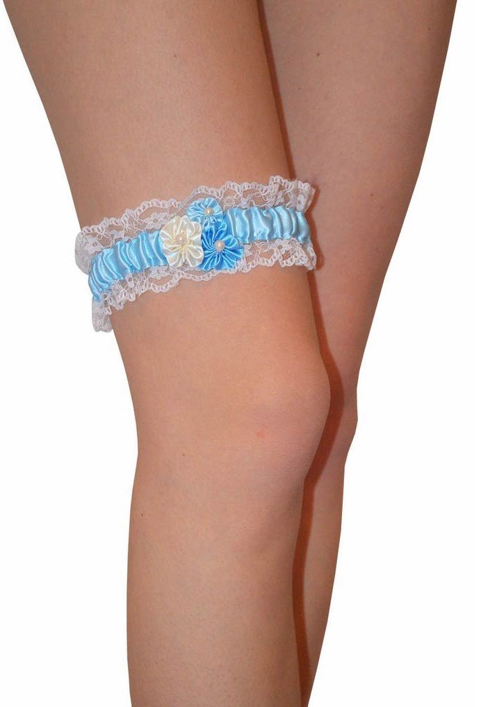 Очаровательная голубая подвязка на ногу, с кружевными оборками. Подвязка для ролевых игр, украшена маленькими цветочками из атласа.