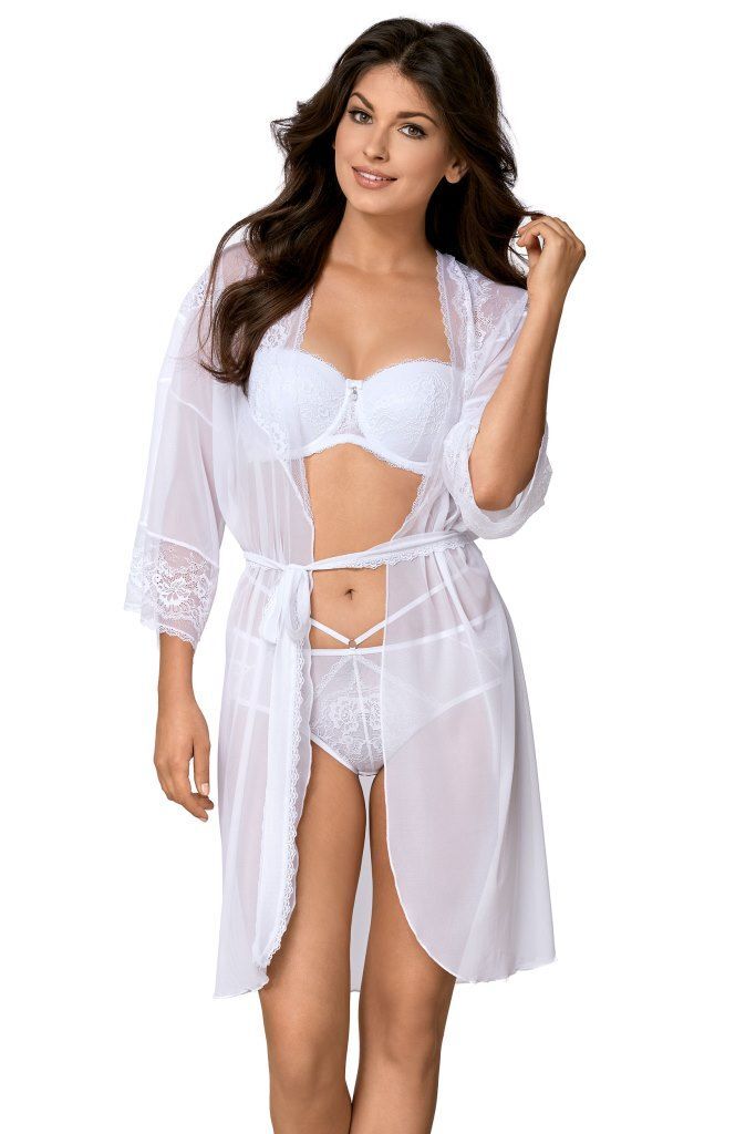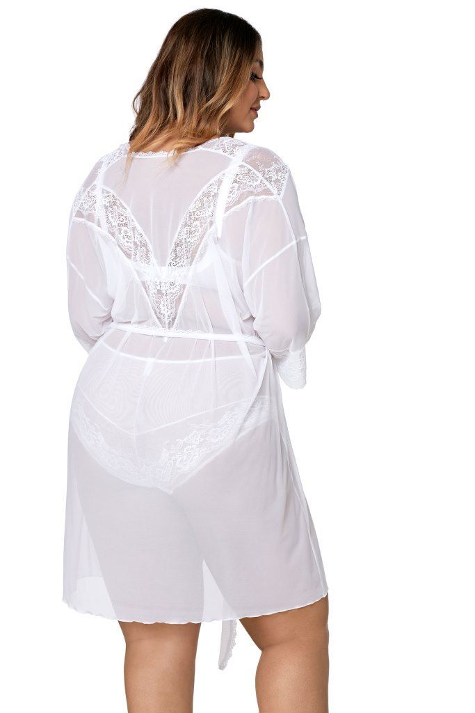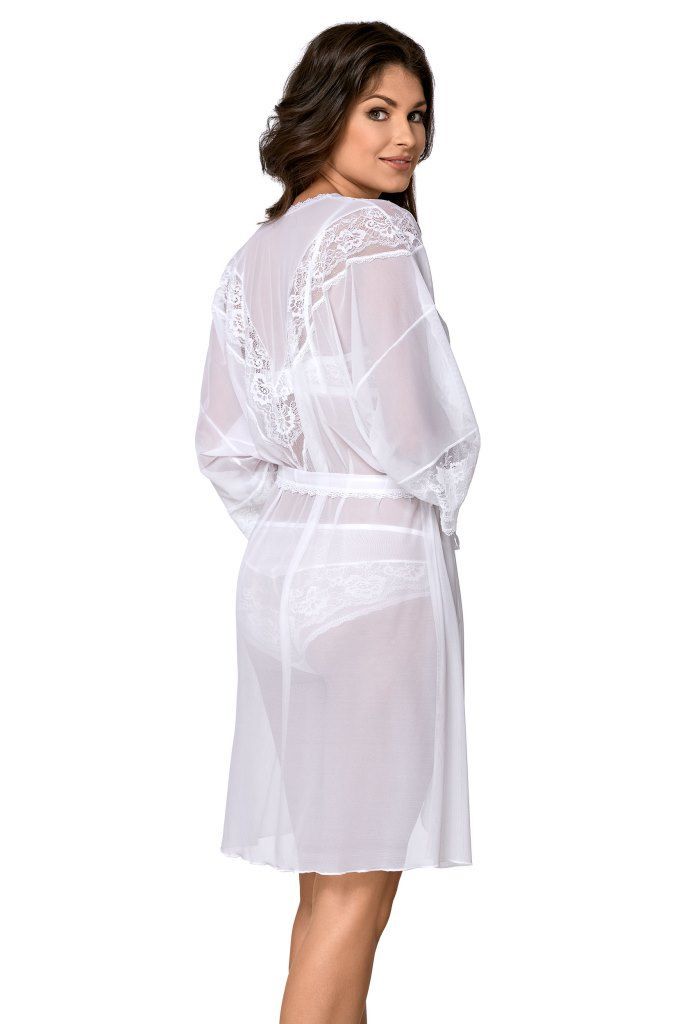Очаровательный пеньюар из прозрачной вуали, глубокий вырез на груди декорирован, как и спинка, изящным кружевом, рукава 3/4 с кружевом.