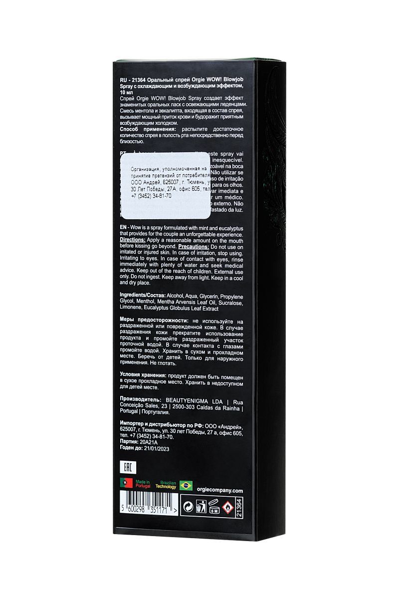 Оральный спрей Orgie WOW! Blowjob Spray с охлаждающим и возбуждающим эффектом. Спрей создает эффект оральных ласк. Смесь ментола и эвкалипта вызывает прилив крови и возбуждает холодком.