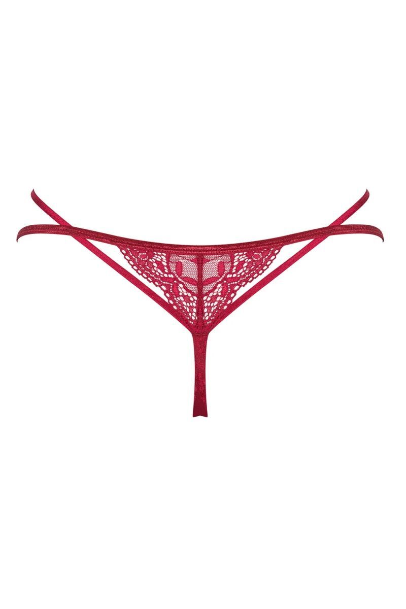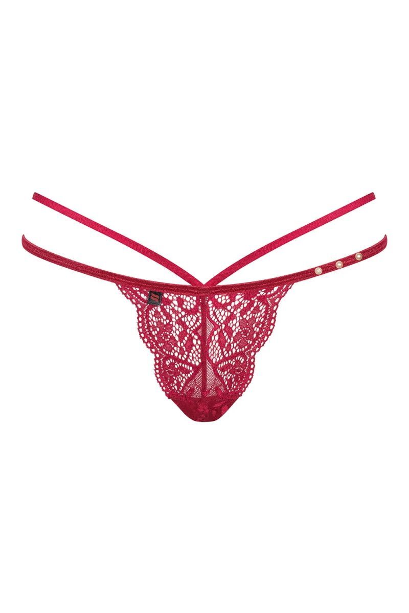 Страстные трусики-стринги из узорчатого кружева. Тонкие эластичные тесемки окутывают бедра. Три белые жемчужинки украшают трусики сбоку. Сзади ремешки эффектно переплетаются, акцентируя внимание на ягодицах.