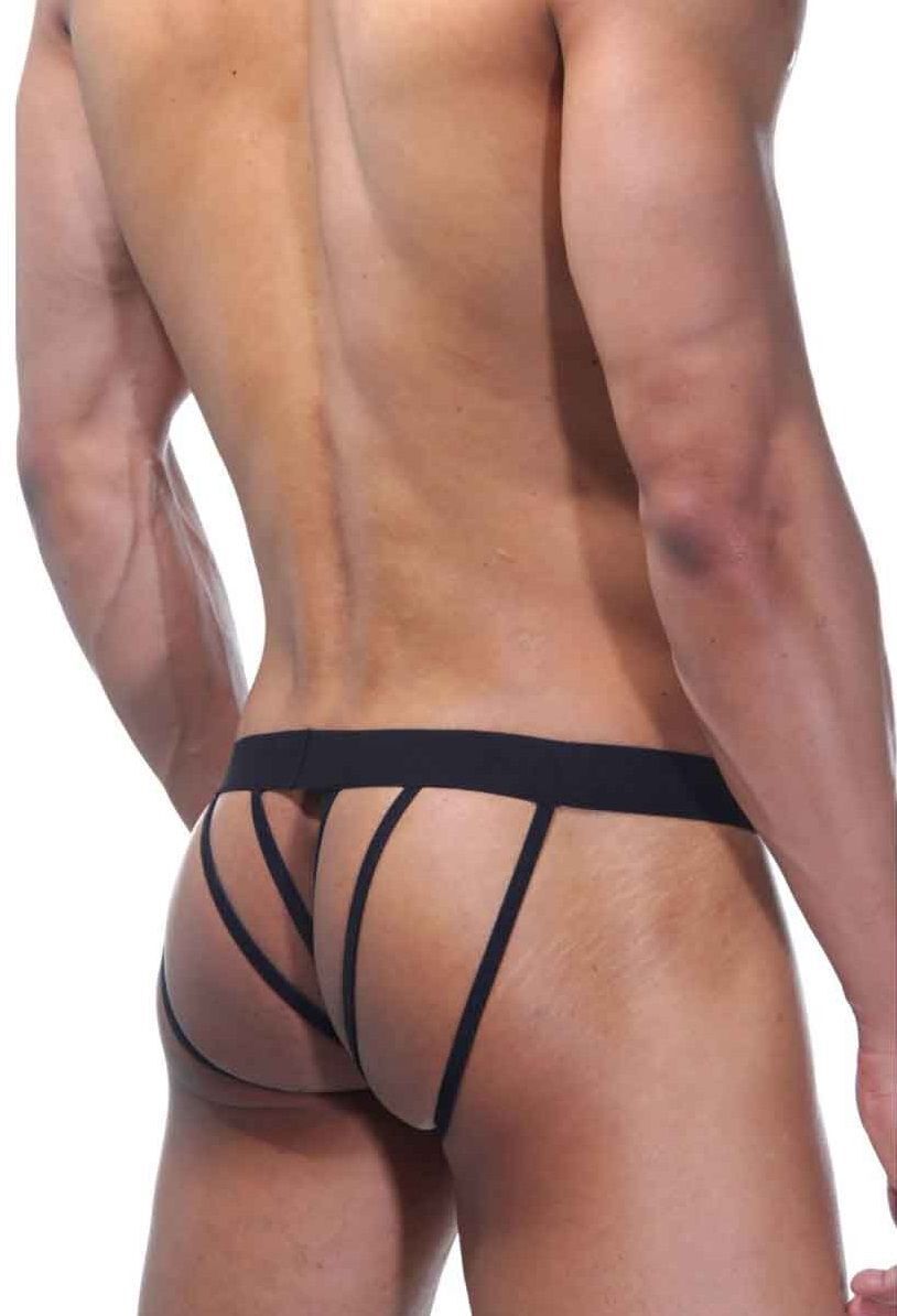 Мужские трусы из полупрозрачной ткани, с интимным вырезом спереди, на широкой резинке. Сзади трусы имеют оригинальный дизайн из тонких резиночек.