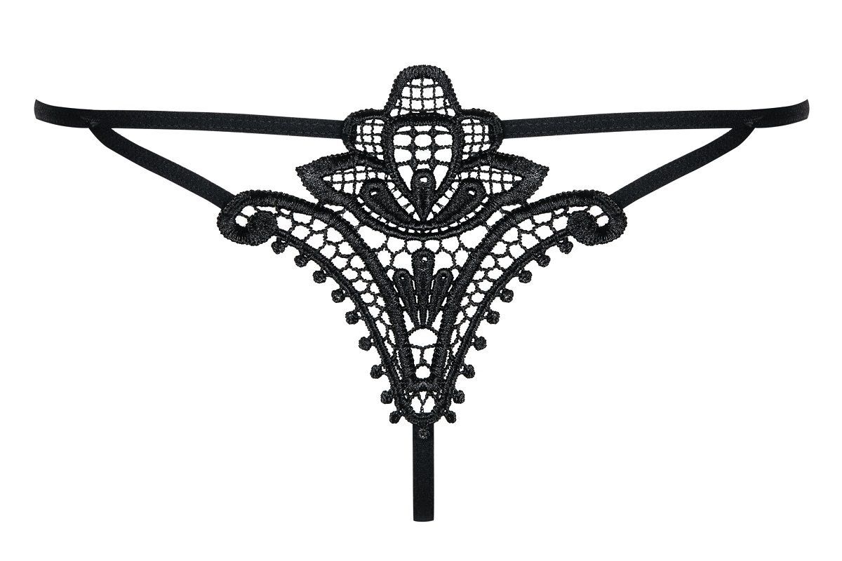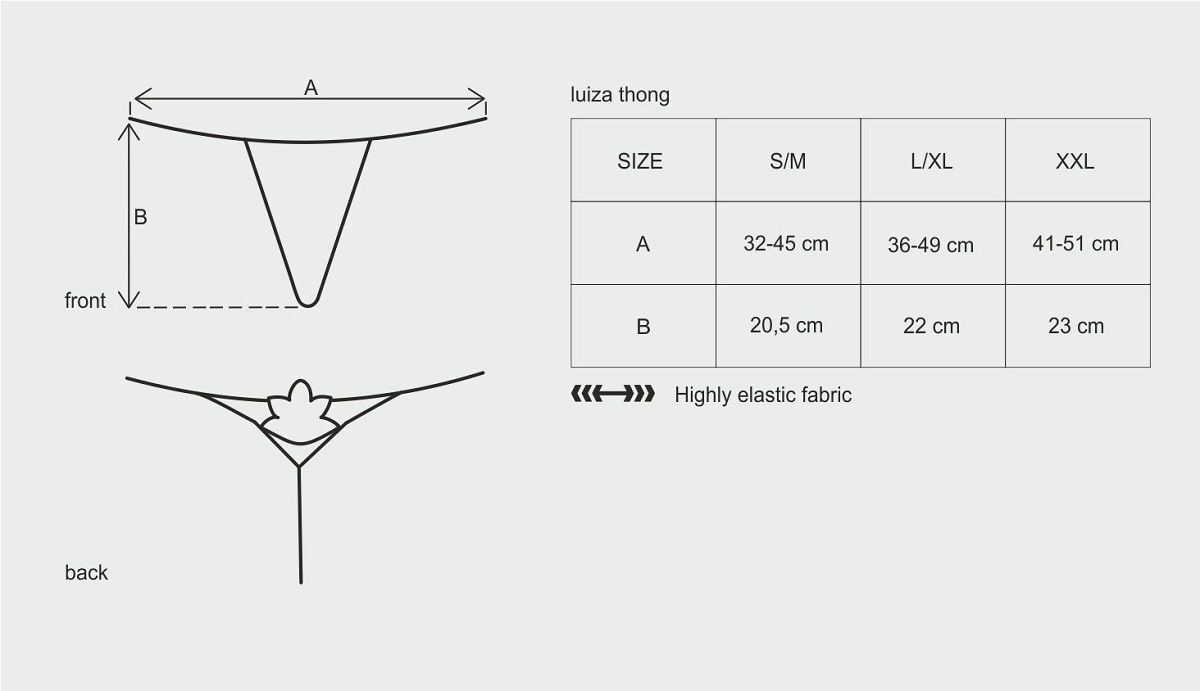 Luiza – оригинальные трусики на каждый день и одновременно для особых случаев. Спереди – полупрозрачная сетка, лишь частично укрывающая, словно тенью, зону бикини. Сзади – чарующий цветочный узор с завитками, притягивающий взгляд к ложбинке попки. Трусики-стринги облегают бёдра и фиксируются благодаря эластичным бретелям.