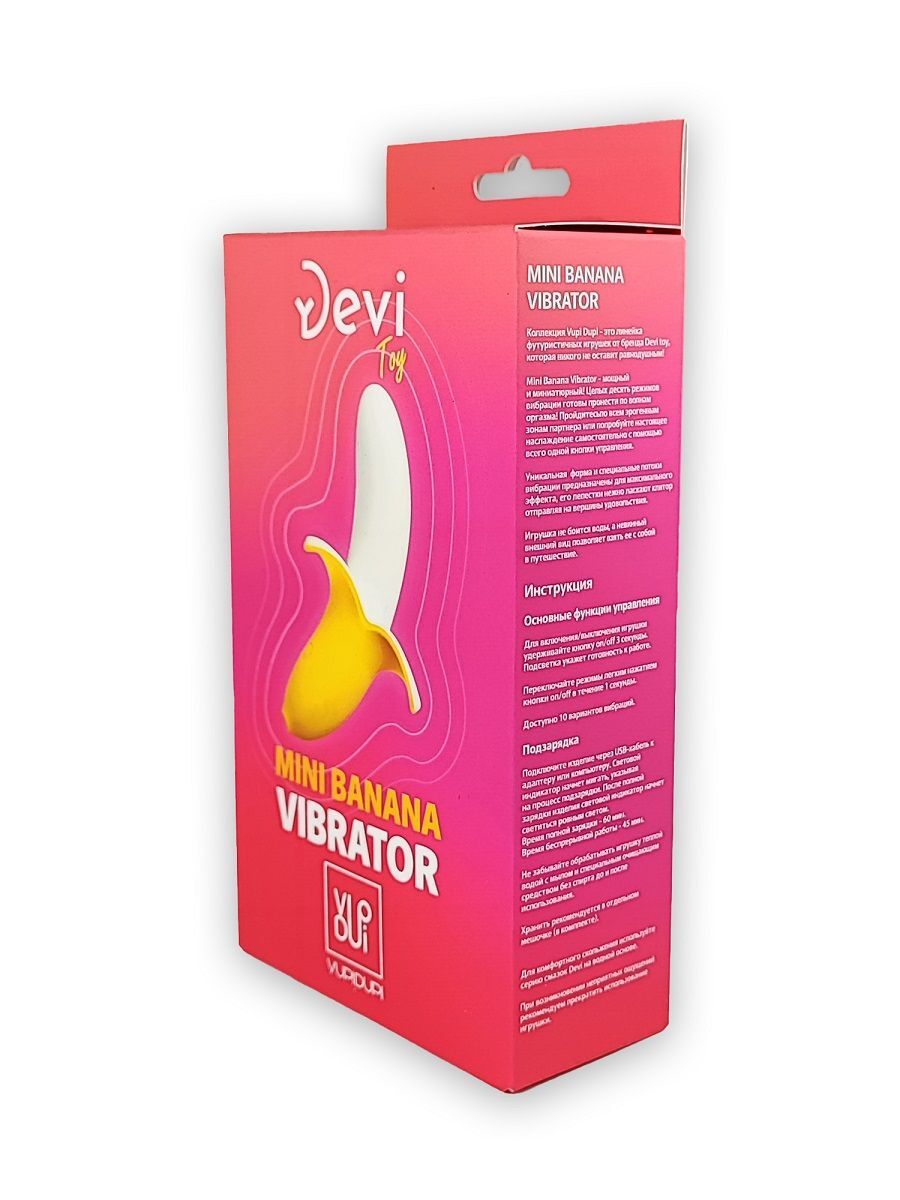 Mini Banana Vibrator - мощный и миниатюрный! Целых десять режимов вибрации готовы пронести по волнам оргазма! Пройдитесь по всем эрогенным зонам партнера или попробуйте настоящее наслаждение самостоятельно с помощью всего одной кнопки управления. Уникальная форма и специальные потоки вибрации предназначены для максимального эффекта, его лепестки нежно ласкают клитор отправляя на вершины удовольствия. Игрушка не боится воды, а невинный внешний вид позволяет взять ее с собой в путешествие. 10 режимов вибрации. Рабочая длина - 8,5 см. Время работы - 45 мин. Время зарядки - 60 мин.