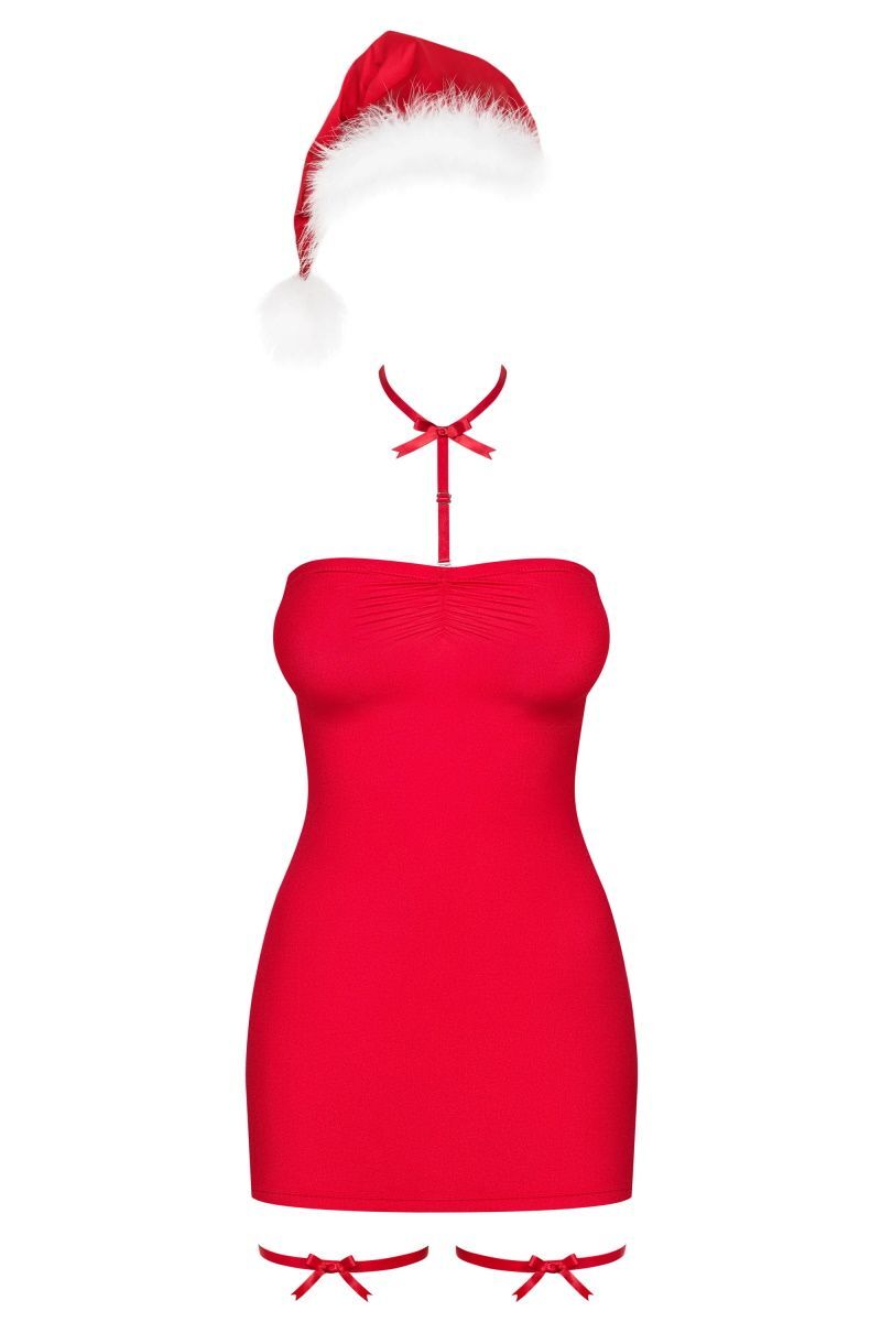 Очаровательная сорочка Kissmas выполнена из эластичного материала, без бретелей c силиконовой полоской вверху. В комплекте чокер из эластичных ремешков, подвязки для ног и новогодняя шапка. В комплекте: чокер, подвязки для ног, шапка, сорочка.
