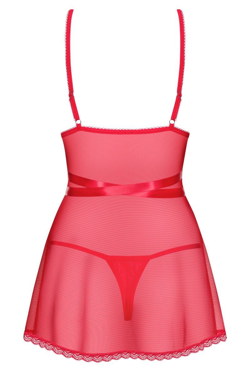 Короткая сорочка изготовлена из прозрачного тюля. Мягкие чашечки из кружева с цветочным мотивом дополнены тонкими ремешками и украшены аккуратными бантиками. Бретели регулируются по длине. Атласная лента обвивается вокруг тела и завязывается бантом спереди. Подол обшит кружевной оборкой. В комплекте: сорочка, трусики-стринги.
