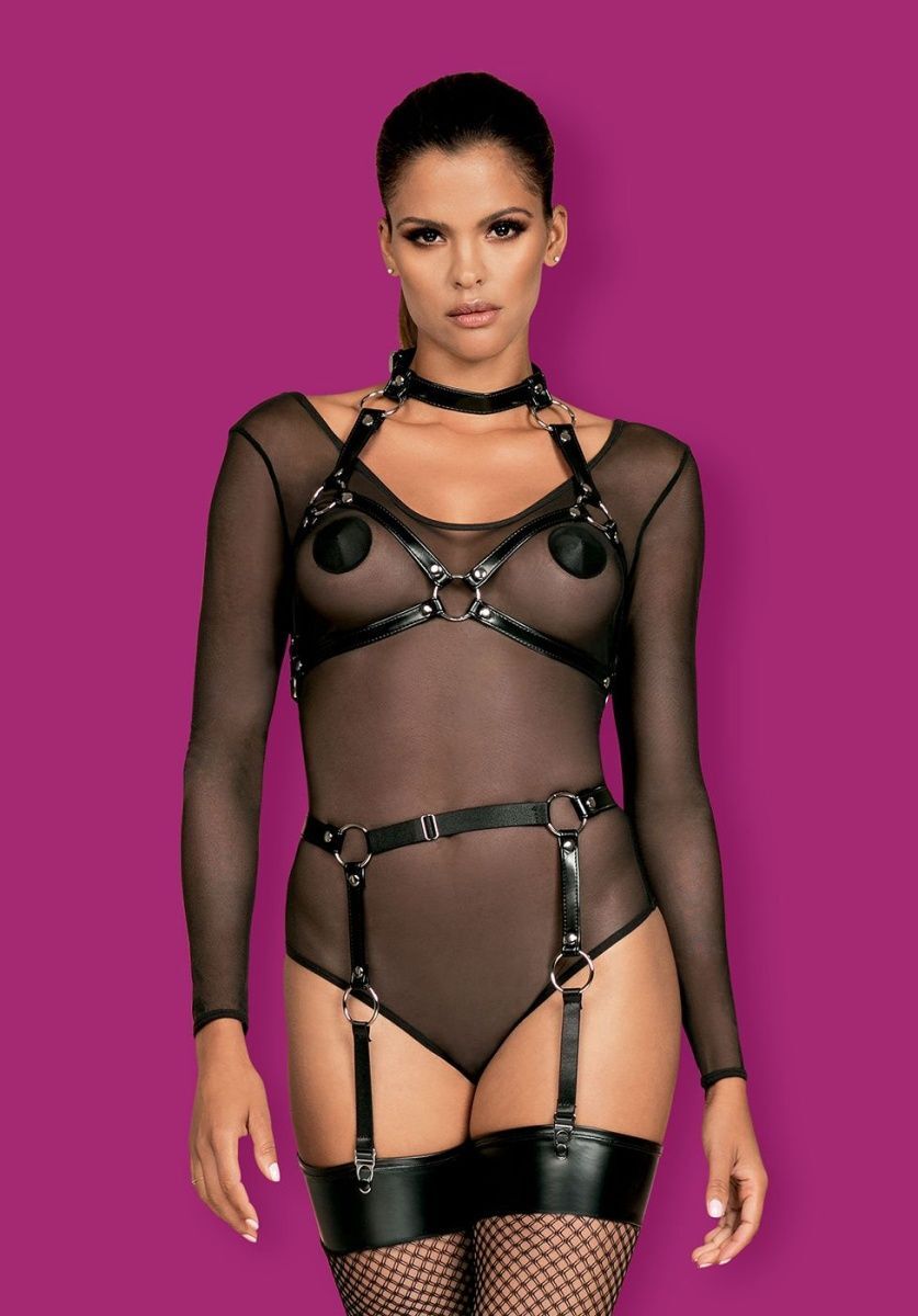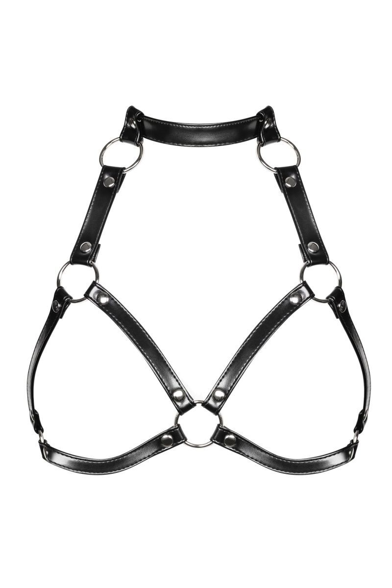 Портупея в виде бюстгальтера. Изготовлена из прочного материала, имитирующего кожу и металла. Прочные ремешки соединяются между собой при помощи колец. На шее и спине регулировка по длине. Металлические заклепки украшают портупею.
