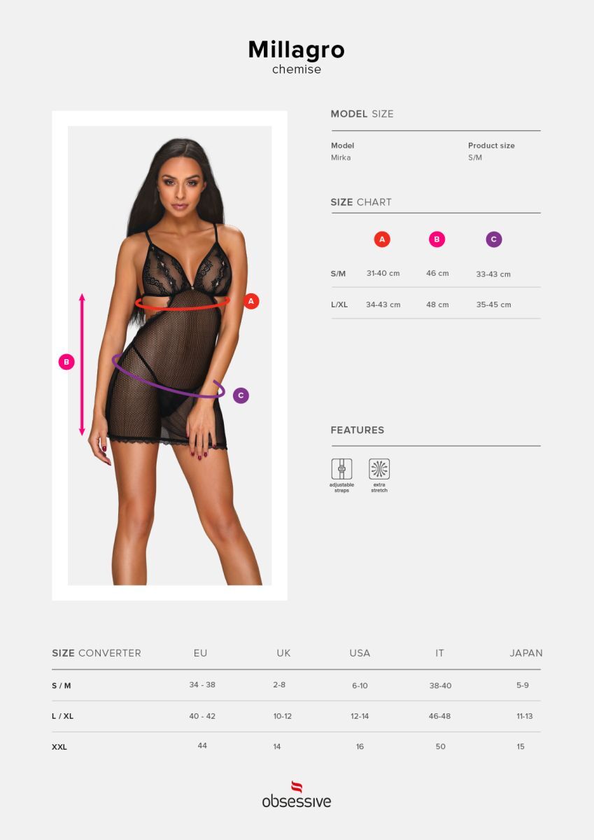 Соблазнительная сорочка Millagro выполнена из эластичной сеточки и кружева. Лиф мягкий без косточек с разрезами, бретели регулируются по длине, на спинке удобная застежка. Сзади пикантный разрез. В комплект к сорочке идут трусики-стринги. Изделие упаковано в красивую плотную коробочку и отлично подойдет в качестве подарка. В комплекте: сорочка, трусики-стринги.