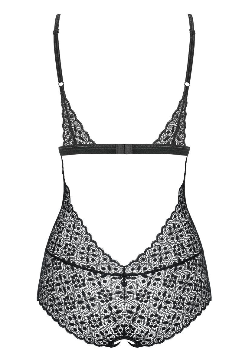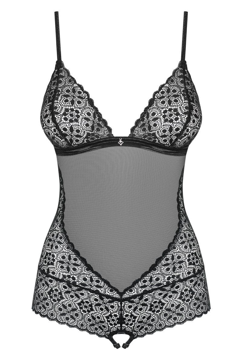 Чувственное боди, выполненное из сочетание прозрачной ткани и тонкого кружева. Модель с мягкими чашечками под грудью дополнена атласной окантовкой и небольшим украшением. Чуть ниже вставка из прозрачной ткани. Сзади застежка на крючки. Бретели регулируются по длине. Кружевная ткань на бедрах и ягодицах великолепно подчеркивает женскую фигуру. Пикантная деталь в виде открытой промежности делает модель еще более сексуальной.