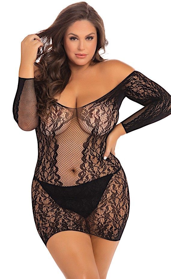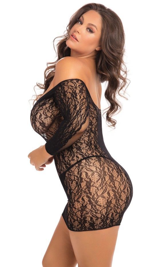 Эротическое мини-платье с длинными рукавами и открытыми плечами. Нежная сетка-паутинка с фантазийным орнаментом. Трусики не входят в комплект!