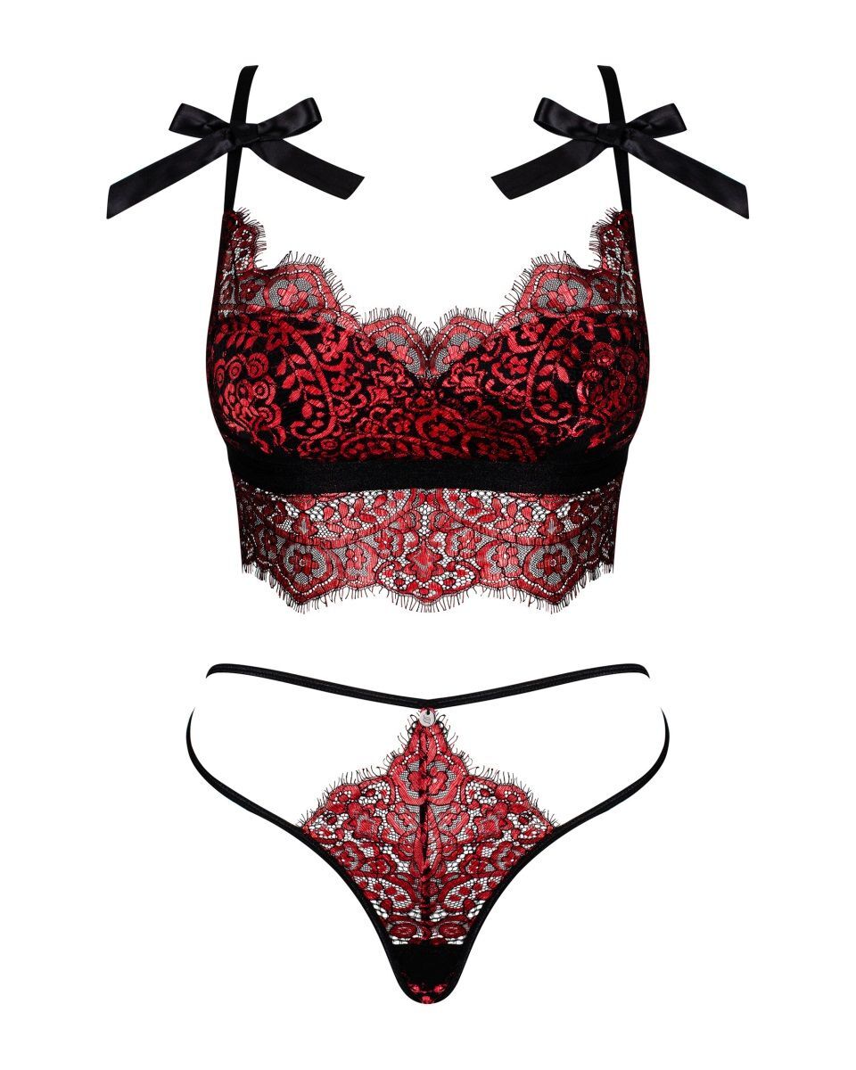 Комплект белья из серии Redessia из кружева с цветочным рисунком с ресничками. Топ без косточек, с тонким поролоном, тонкие бретельки регулируются по длине, на плечах атласные банты, на спине застежка-удлинитель, широкое кружево под бюстом визуально вытягивает силуэт. В комплект к бюстгальтеру идут кружевные трусики-стринги с двойными тонкими союзками. В комплекте: бюстгальтер, трусики.
