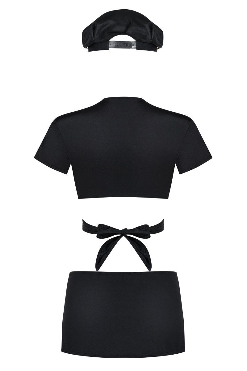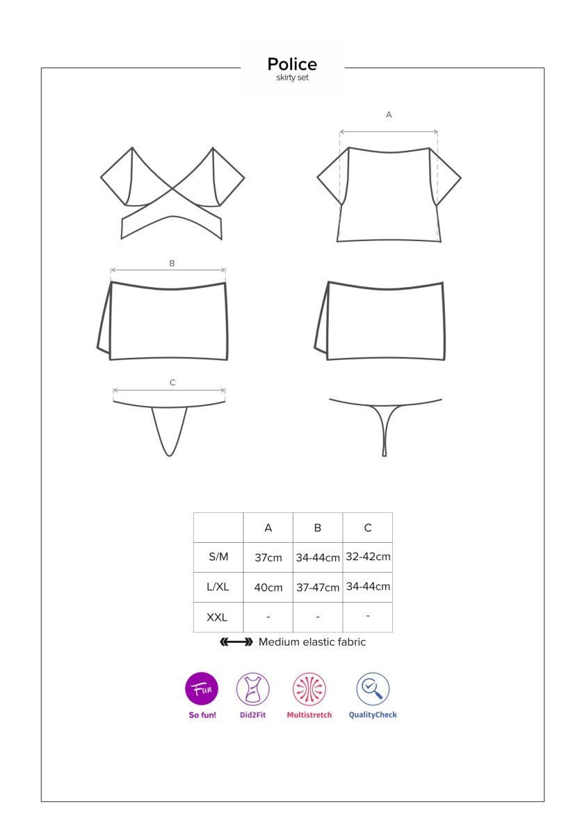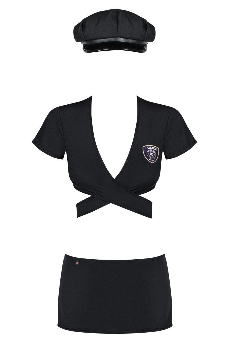 Ролевой костюм полицейского из четырех предметов. Короткий облегающий топ с глубоким вырезом и короткими рукавами декорирован нашивкой. Завязки на спине обеспечивают идеальную посадку по фигуре. Откровенная обтягивающая мини юбка дополнена разрезами по бокам. Фуражка с декоративными элементами и глянцевым козырьком добавляет игре реалистичности. Трусики стринг включены в комплект. В комплекте: топ, юбка, фуражка, трусики-стринги.