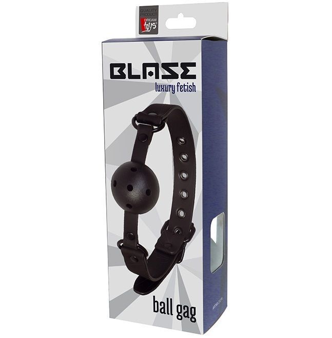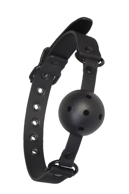 Пластиковый кляп-шар с отверстиями для дыхания и фиксирующими полиуретановыми ремешками.