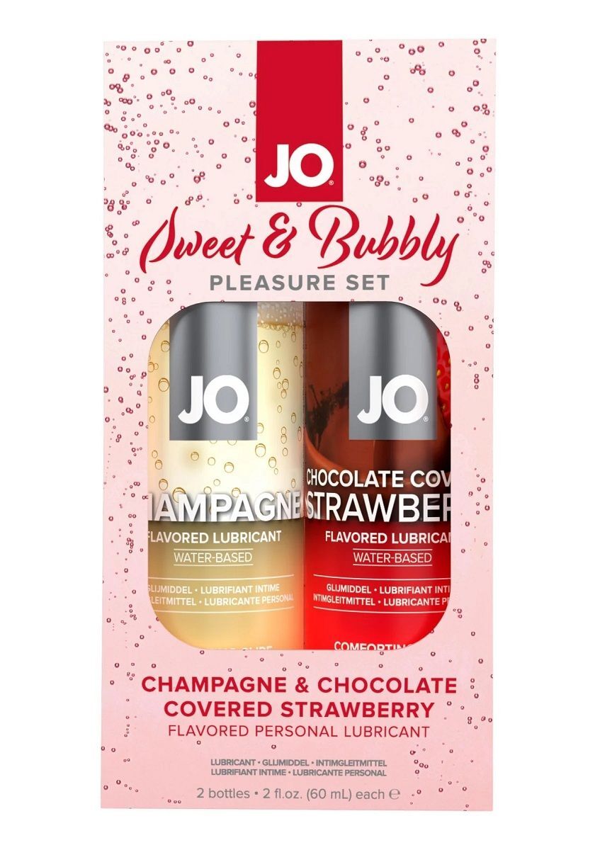 Набор из лубрикантов JO: Champagne и Chocolate Covered Strawberry, станет прекрасным дополнением к романтическому вечеру. Благодаря вкусовым лубрикантам оральные ласки становятся более приятными и страстными. Вкусовые лубриканты обеспечивают длительное гладкое скольжение без липкости и скатывания. Благодаря только натуральным ароматизаторам они имеют естественный вкус шампанского и клубники в шоколаде. Не содержат сахара и подсластителей. Не нарушают микрофлору и кислотно-щелочной баланс. Лубриканты имеют водную основу, но она такая же нежная как силикон, обеспечивает долгое скольжение, никакой липкости, легко смывается водой. Лубриканты совместимы с материалами большинства игрушек. Обладают всеми преимуществами фаворита JO H2O, плюс приятный аромат и нежная сладость. Идеальны для оральных игр. Совместимы с алкоголем. Можно добавлять в напитки, использовать как топинг, смешивать коктейли из разных вкусов. Небольшое количество персонального лубриканта нанесите на интимные участки. Для использования с презервативом нанесите на наружную сторону презерватива. Безопасен для латексных изделий. В наборе: лубрикант с ароматом шампанского Champagne (60 мл.), лубрикант с ароматом клубники в шоколаде Chocolate Covered Strawberry (60 мл.).