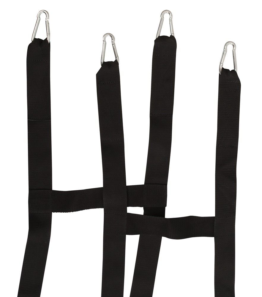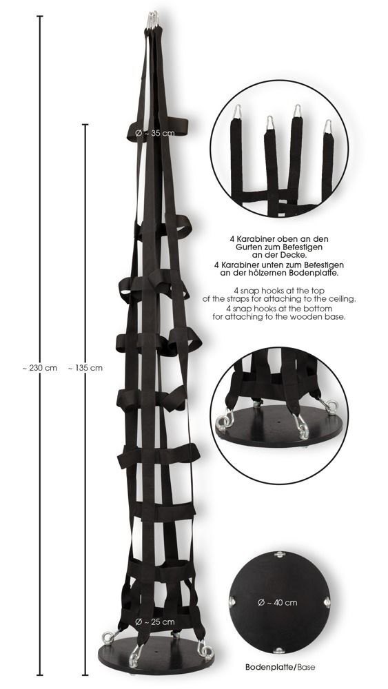 Подвесная клетка из ремешков плотно и крепко сковывает тело - вырваться невозможно! Конструкция ремней из прочных текстильных лент быстро и легко зацепляется карабинами за прочную круглую деревянную стойку. 4 вертикальных ремня также оснащены прочными карабинами в верхней части, которые можно прикрепить к потолочному крюку (не прилагается) или, например, к дереву, столбу или т.п. Высота клетки - 135 см. Диаметр основания - 40 см. Максимальная нагрузка - 100 кг.