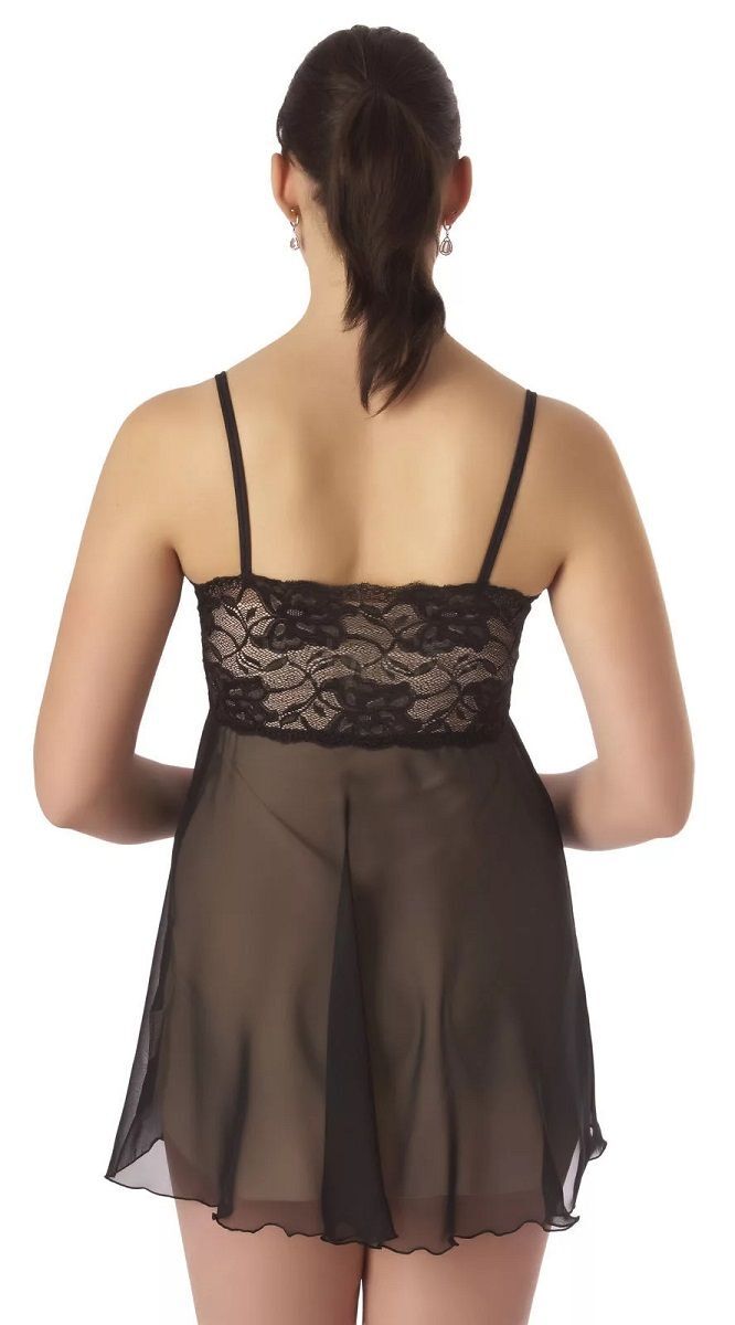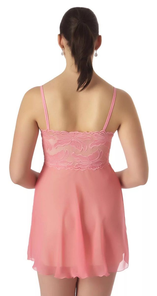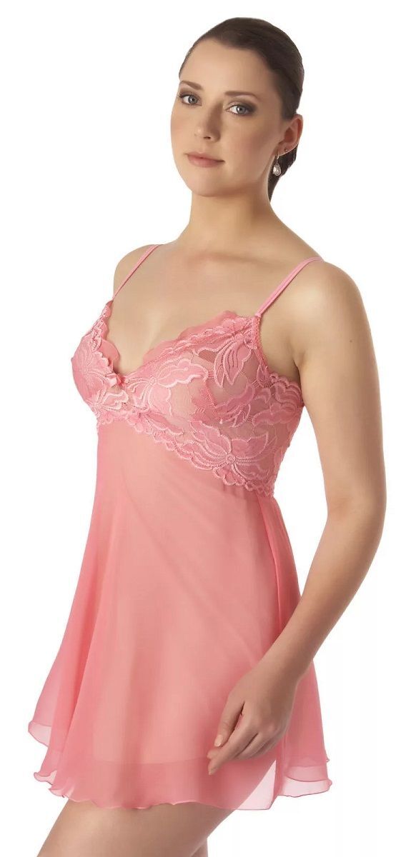 Полупрозрачная летящая сорочка из однотонного шифона. Лиф сорочки из эластичного кружева с цветочным мотивом, линия выреза горловины изящно подчеркнута узкой прозрачной рюшкой, по центру атласный бантик юбка расширена книзу. Чашечки лифа обеспечивают комфорт для груди.