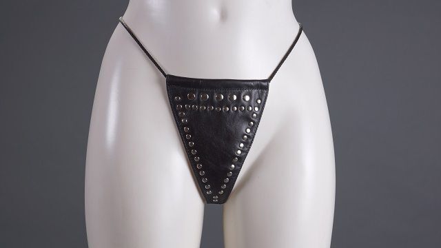 Женские трусики изготовлены из натуральной кожи и украшены узором из заклепок. При производстве использована никелированная фурнитура. Размер регулируется ремешками.