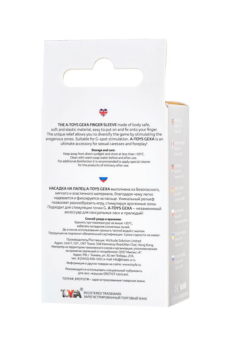 Насадка на палец A-Toys Gexa выполнена из безопасного, мягкого и эластичного материала, благодаря чему легко надевается и фиксируется на пальце. Уникальный рельеф позволяет разнообразить игру, стимулируя эрогенные зоны. Подходит для стимуляции точки G. A-Toys Gexa – незаменимый аксессуар для сексуальных ласк и прелюдий!