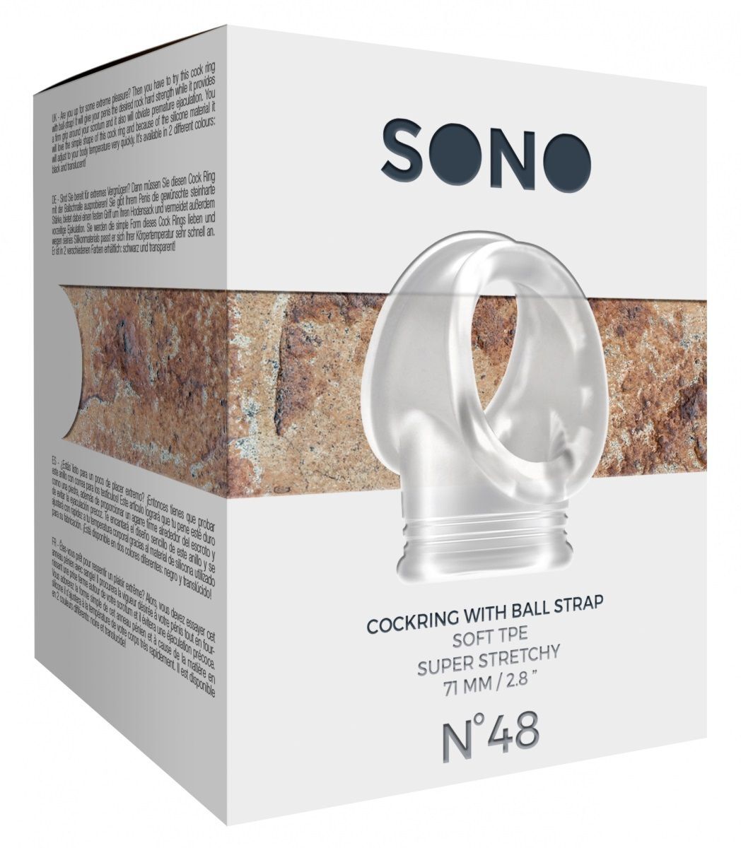 No.48 Cockring with Ball Strap – простое и элегантное эрекционное кольцо для пениса и мошонки, изготовленное из эластичного, легко принимающего температуру тела материала. Кольцо препятствует оттоку крови для поддержания эрекции, обеспечивает плотную утяжку яичек, замедляя процесс эякуляции. Внутренний диаметр - 3 см.