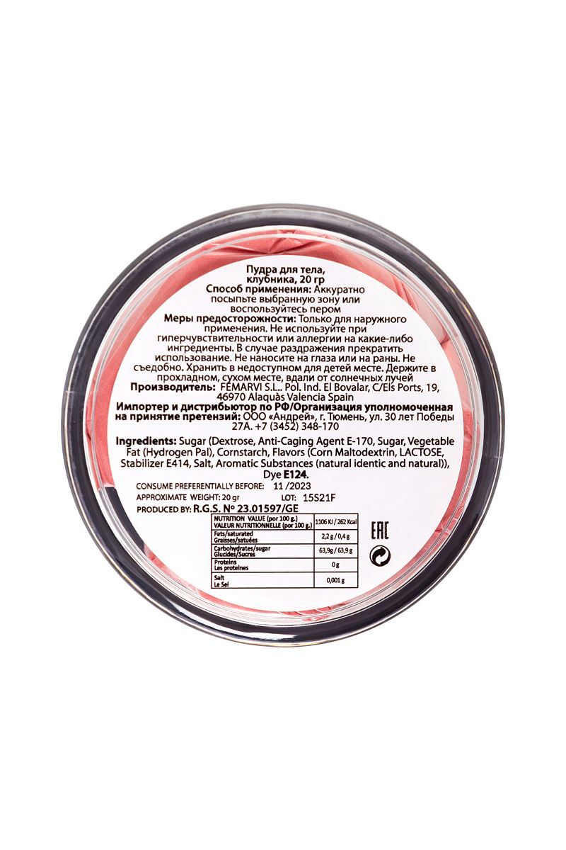 Новый способ развлечь и удивить друг друга – пудра для тела, которую приятно слизывать и целовать. STRAWBERRY EDIBLE BODY POWDER от Secret Play – вкусная пудра с мягким вкусом, чтобы превратить вашего партнера в изысканное лакомство. Безграничное удовольствие – посыпать пудрой нежные участки тела и слизывать. Предложите партнеру оставить на своем теле любовный маршрут и двигайтесь по нему языком и губами, пока не останется следов, используйте для прелюдии или для оральных ласк. Мммм вкусно и ароматно! Безопасный состав для применения на любых участках тела с восхитительным вкусом и ароматом клубники.