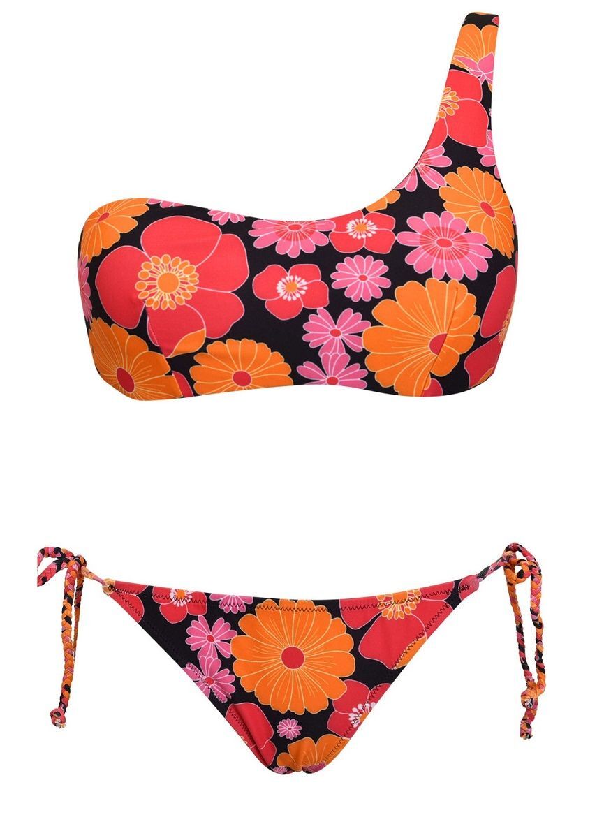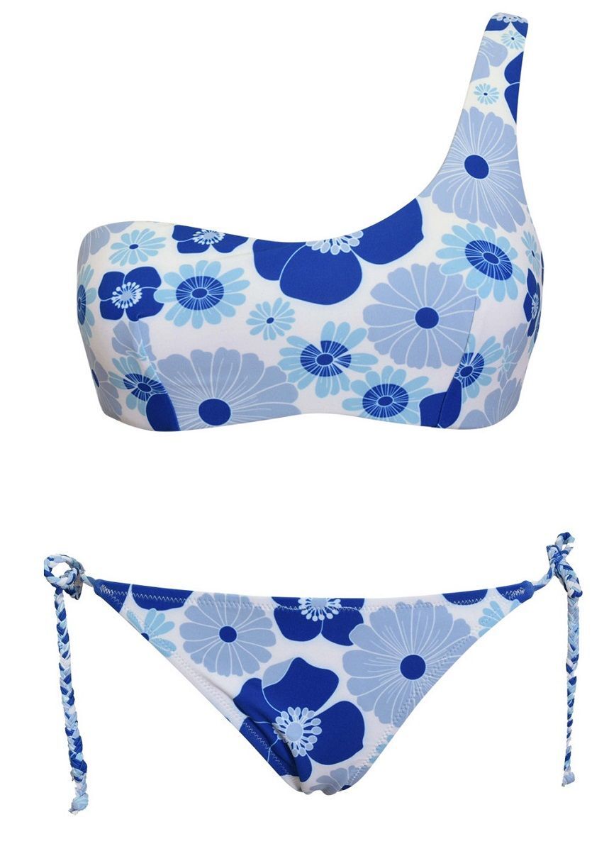 Раздельный купальник: топ с мягкой чашкой на скрытых косточках со съемными формованными вкладышами без пуш-ап, бочок усилен костью. Трусики-танга на завязках. В комплекте: топ, плавки.