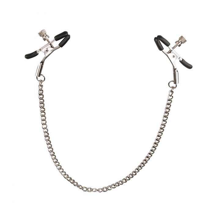 Клипсы на соски, соединенные цепочкой из серебристого металла, с возможностью регулировать силу зажима. Зажимы покрыты резиновыми прокладочками, чтобы не повредить нежную кожу сосков. Клипсы очень удобны и просты в обращении.