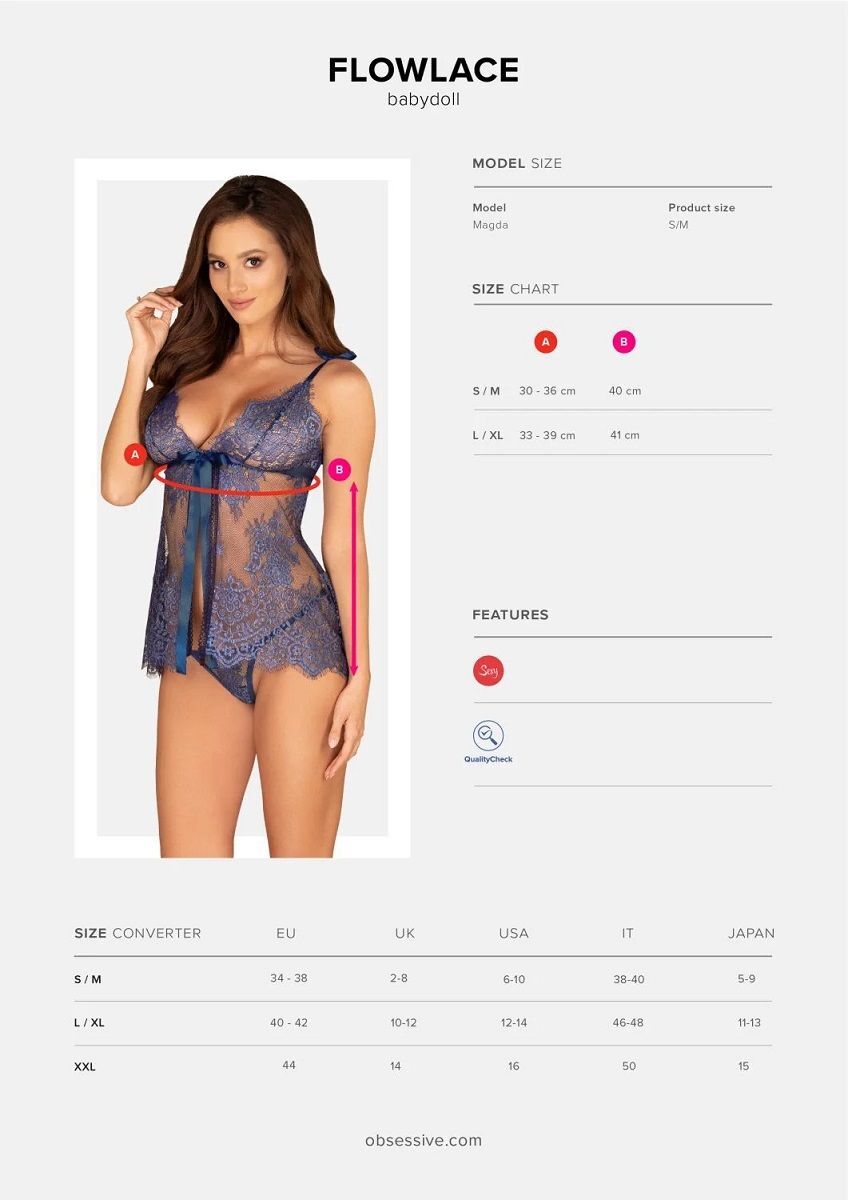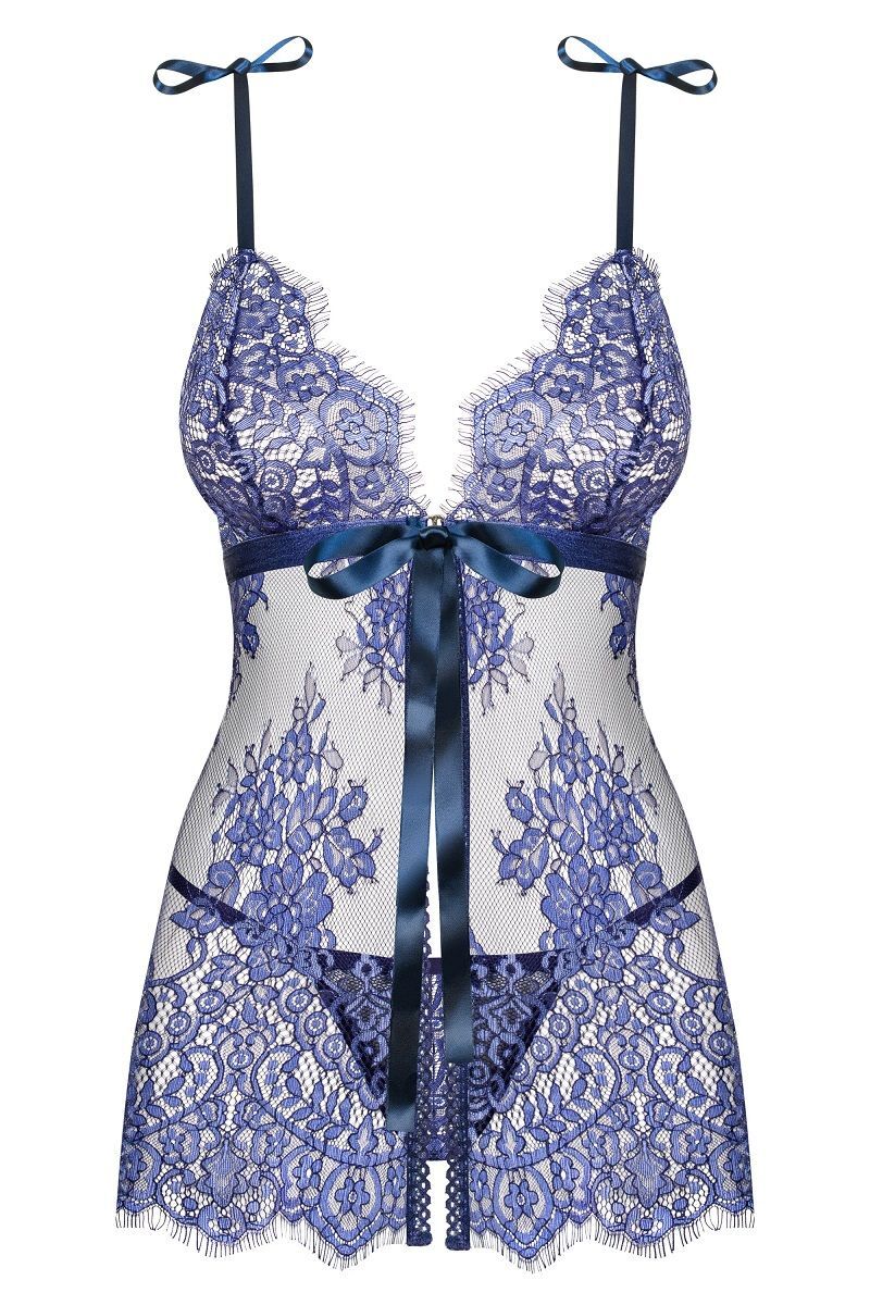 Роскошная кружевная сорочка беби-долл Flowlace. Лиф мягкий без косточек. Бретели на завязках. Между чашек застежка на крючок и атласный бант с длинными лентами. В комплекте: сорочка и трусики-стринги.
