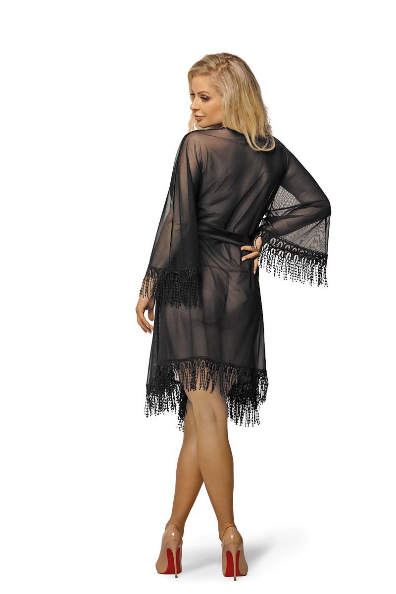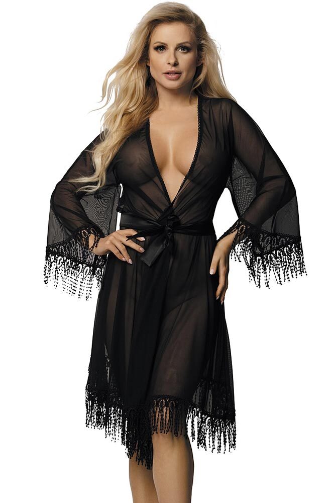 Роскошный пеньюар из прозрачной чёрной вуали. Низ и рукава украшены изящным кружевом с бахромой, завязывается на атласный поясок. Халатик комплектуется трусиками-стрингами. В комплекте: пеньюар, трусики-стринги.