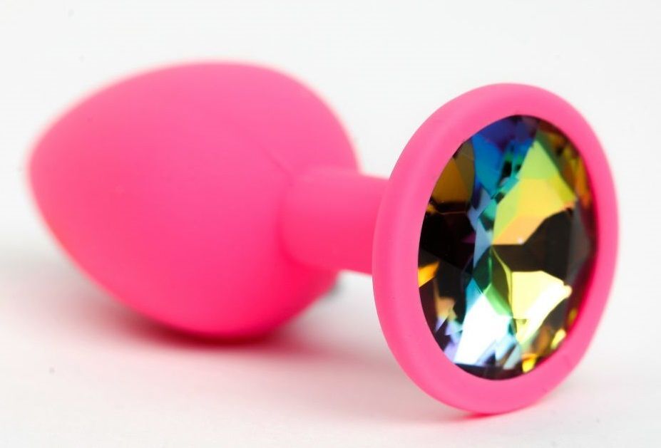 Розовая анальная пробка с радужным стразом - 7,6 см.