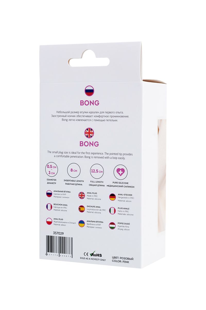 Анальная втулка Bong. Небольшой размер втулки идеален для первого опыта. Заостренный кончик обеспечивает комфортное проникновение. Bong легко извлекается с помощью петельки. Рабочая длина - 8 см. Минимальный диаметр - 0,5 см.
