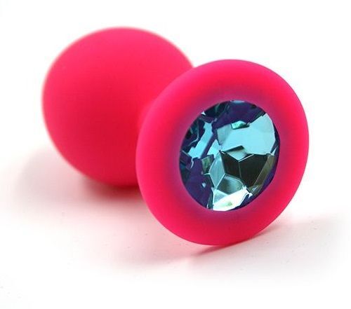 Анальная пробка из силикона розового цвета, размер M. Страз в основании круглой формы, выполнен из стекла голубого цвета. Упакована в вельветовый мешочек для хранения. Вес - 46,5 граммов.
