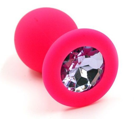 Анальная пробка из силикона розового цвета, размер M. Страз в основании круглой формы, выполнен из стекла светло-розового цвета. Упакована в вельветовый мешочек для хранения. Вес - 46,5 граммов.
